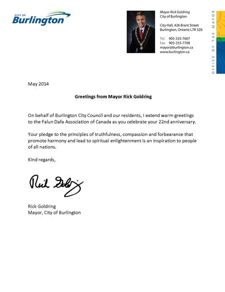 伯灵顿(Burlington)市长瑞克•古德瑞(Rick Goldring)表示:“我谨代表伯灵顿市政府及全体居民,向加拿大法轮大法学会举办的(法轮大法传世)二十二周年庆祝活动致以诚挚的问候。你们信守法轮大法‘真善忍’的准则,倡导和谐生活,提升精神道德水平,这是对各族裔民众的启迪。”