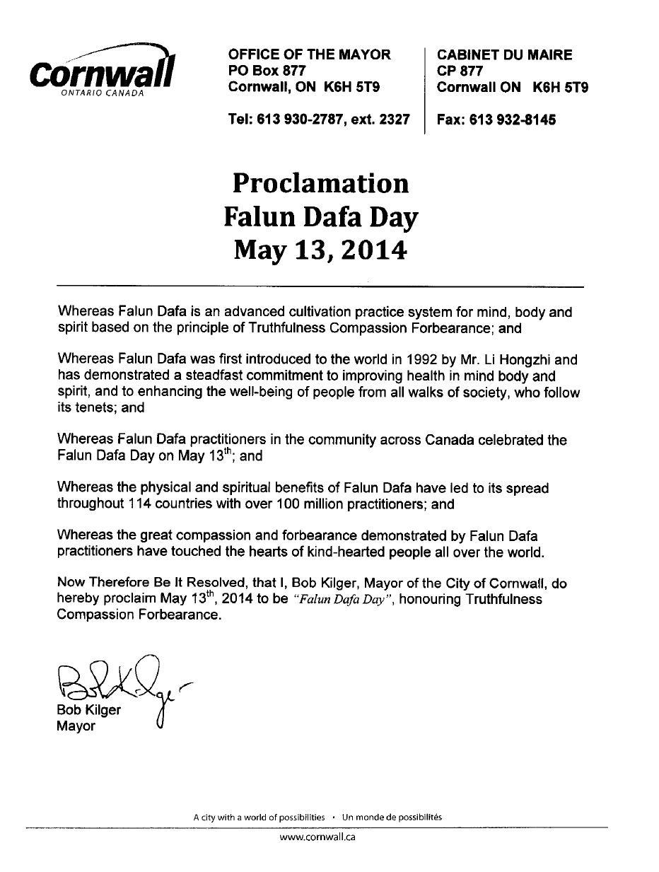 康沃尔(Cornwall)市长鲍比•基尔格(Bob Kilger)颁发了褒奖,宣布二零一四年五月十三日为“法轮大法日”。褒奖译文如下: