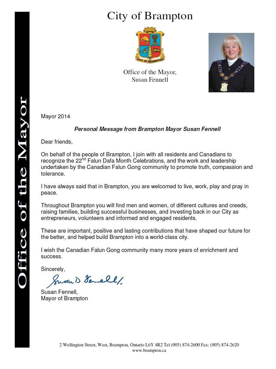 图8:宾顿市(Brampton)市长苏珊•芬内尔(Susan Fennell)发来贺信