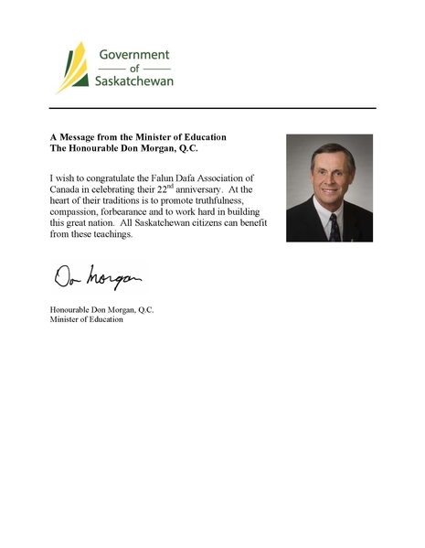 萨省教育厅长摩根(Don Morgan)在贺信中说:“在法轮大法二十二周年庆典之际,我要祝贺加拿大法轮大法学会,他们信仰的核心是弘扬真、善、忍,并努力建设我们这个伟大的国家。所有的萨省居民都将受益于这样的理念。