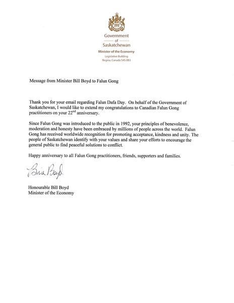 萨省经济厅长博伊德(Bill Boyd)在贺信中说:“在庆祝法轮大法传世二十二周年之际,我代表萨省政府,向加拿大法轮功学员呈上诚挚的祝贺。”