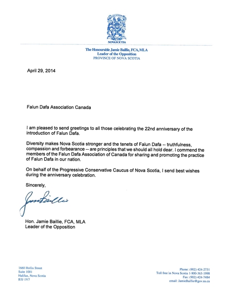 斯高沙省(Nova Scotia)反对党领袖柏利(Jamie Baillie)在贺信中说,他很高兴向法轮大法弘传二十二周年庆典献上贺词。