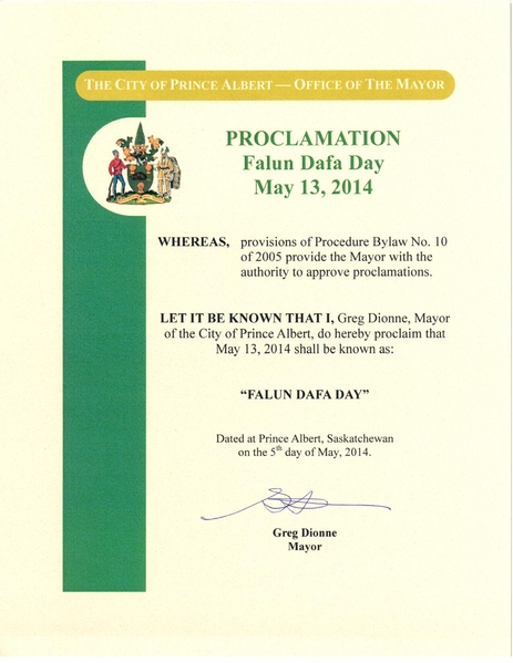 艾伯特王子市(City of Prince Albert)一百一十年前从镇升级为加拿大城市。五月五日,市长迪翁(Greg Dionne)宣布,二零一四年五月十三日是“法轮大法日”。