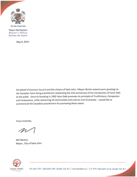![]() 圣约翰市(City of Saint John)市长诺顿(Mel Norton)的贺信 |