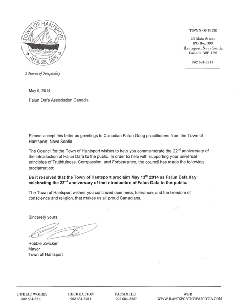 斯高沙省汉茨波特镇(Hantsport)市长兹维克(Robbie Zwicker)五月九日向加拿大法轮大法学会发出贺信,并宣布二零一四年五月十三日是“法轮大法日”。
