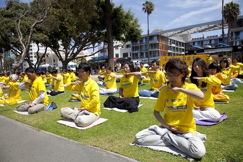 圣塔莫尼卡码头是洛杉矶的著名景点,每年吸引成千上万来自世界各地的游客。法轮功学员的庆祝活动以集体炼功开始,并表演了精心准备的唐鼓、舞蹈、武术、独唱、小提琴独奏、功法表演、腰鼓等节目,吸引许多路人驻足观看、享受尘嚣中这份难得的宁静和殊胜。