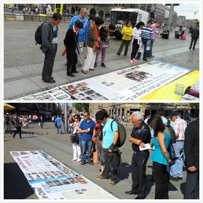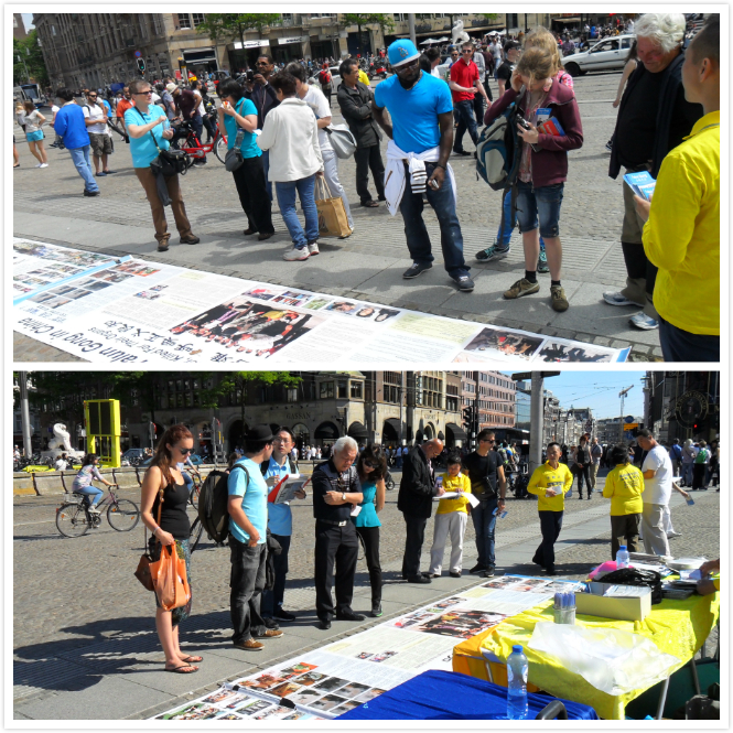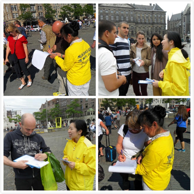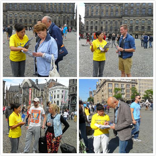 阿姆斯特丹是多种文化融合的地方,又是一个各国旅客的必到之处,皇宫门前达姆广场是各国旅客最集中的地方,各国游客看到真相图片展后,纷纷签名支持法轮功学员的信仰权利,谴责中共残暴屠杀善良公民。