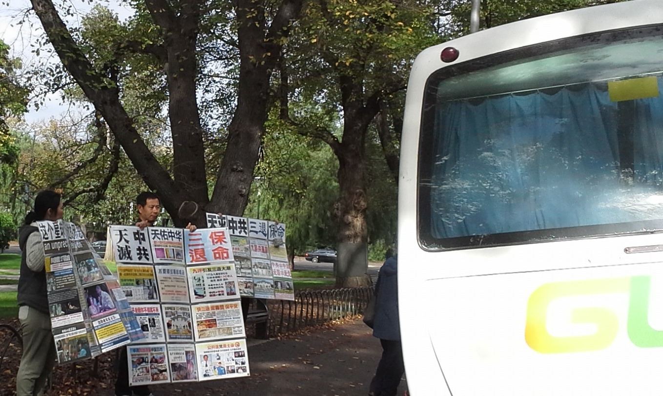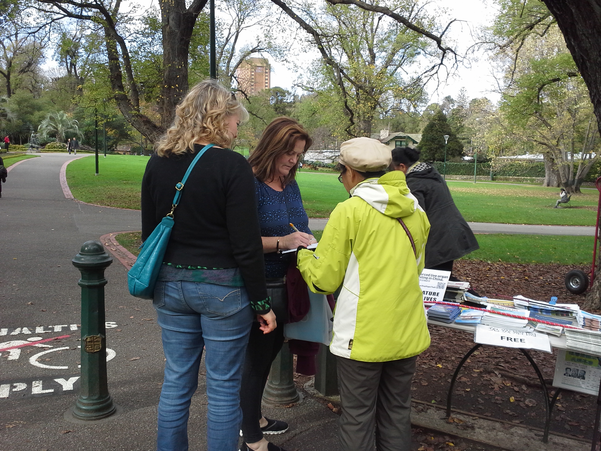 深秋的墨尔本寒风阵阵,法轮功学员的热情的带给游客们真相,温暖入心。