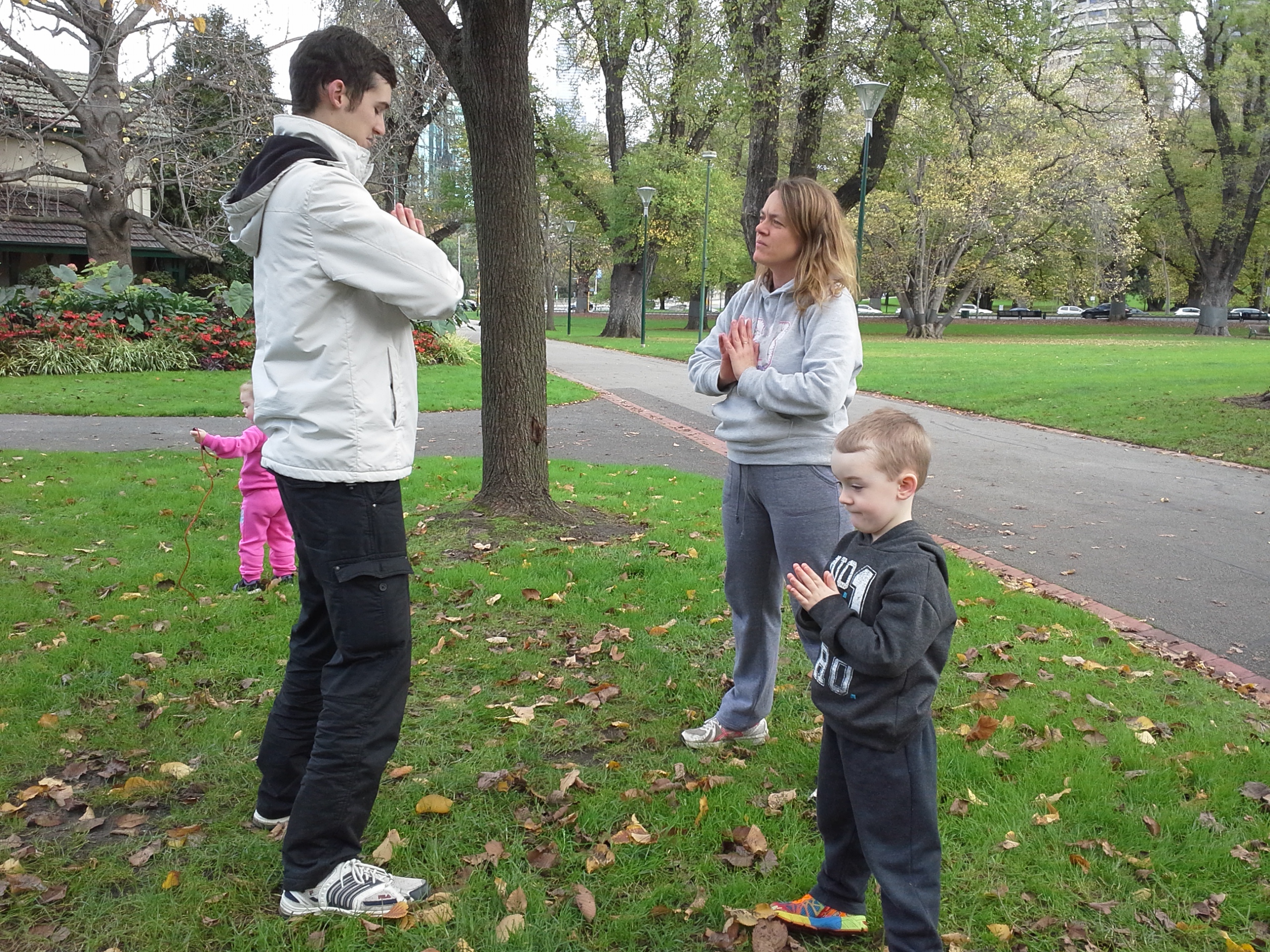 同时,不少西人游客在征签表上签名支持大法弟子的正义之举。特别是一个带着一对年幼儿女的西人女士塔卡(Karissa Tucker),看到真相展板了解到法轮功之后,就产生了浓厚的兴趣,因为她的孩子们对宇宙生命很感兴趣,她也正在找寻获得心灵平静的打坐方法。一位西人学员向塔卡介绍了法轮功功法的特点和自己的修炼体会,之后塔卡学炼了第一套功法。她表示要上网了解更多,也期待一周后的周末再回来学习。她告诉记者,因为自己和两个孩子都体弱多病,希望学了法轮功能让自己和孩子们获得强健的身体。