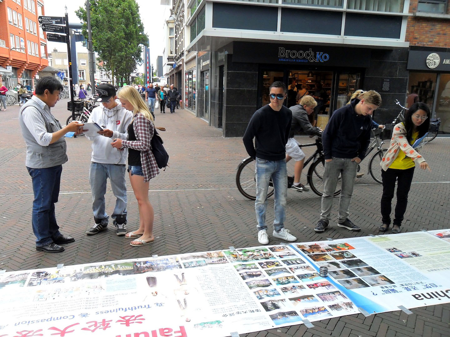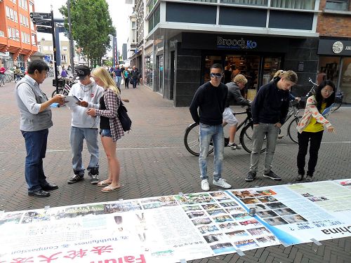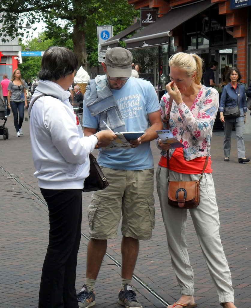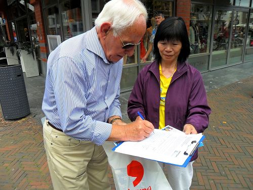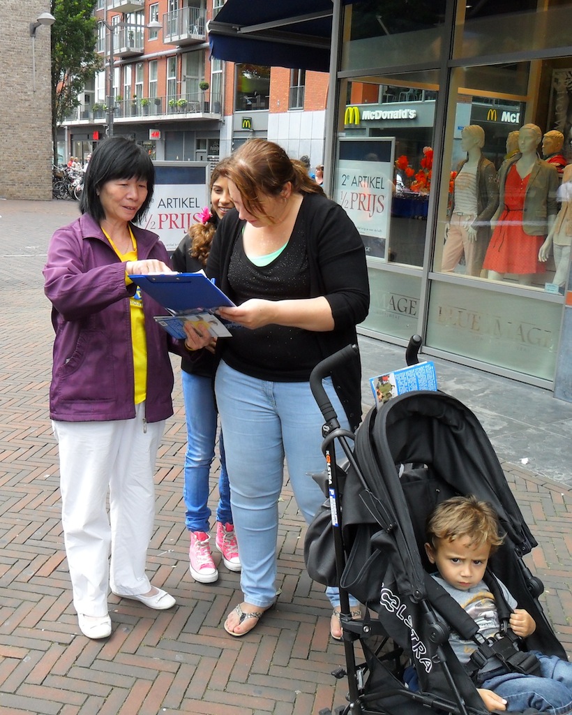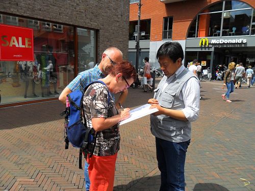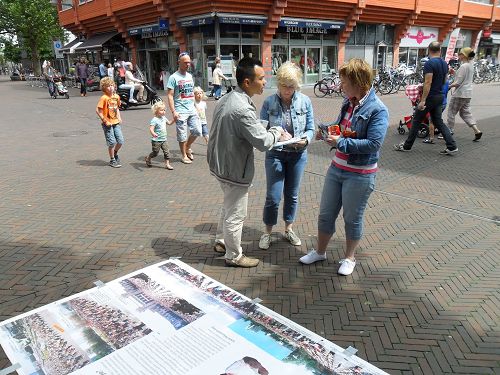 二零一四年六月十四日,荷兰法轮功学员来到北荷兰省阿尔芬市讲真相、征集签名反迫害,当地居民听学员介绍在中国发生的中共对信仰法轮功的公民的迫害都非常震惊,纷纷签名支持法轮功学员信仰的权利。