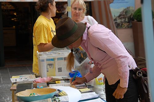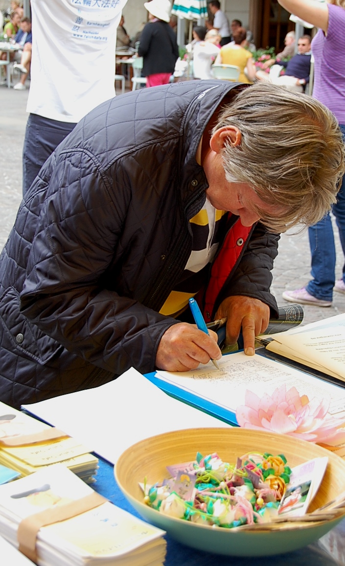 一位萨尔斯堡当地的退休商人,还没有听说过法轮功。他仔细观看了真相展板的图片后表示,他觉得法轮功学员的真相信息日办的很好,很重要。他说,中共迫害法轮功被中共在全世界极力封锁。他表示:“法轮功学员讲真相的活动要多多地讲,多多地做。”他表示也非常敬佩法轮功学员今天站在这里。