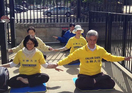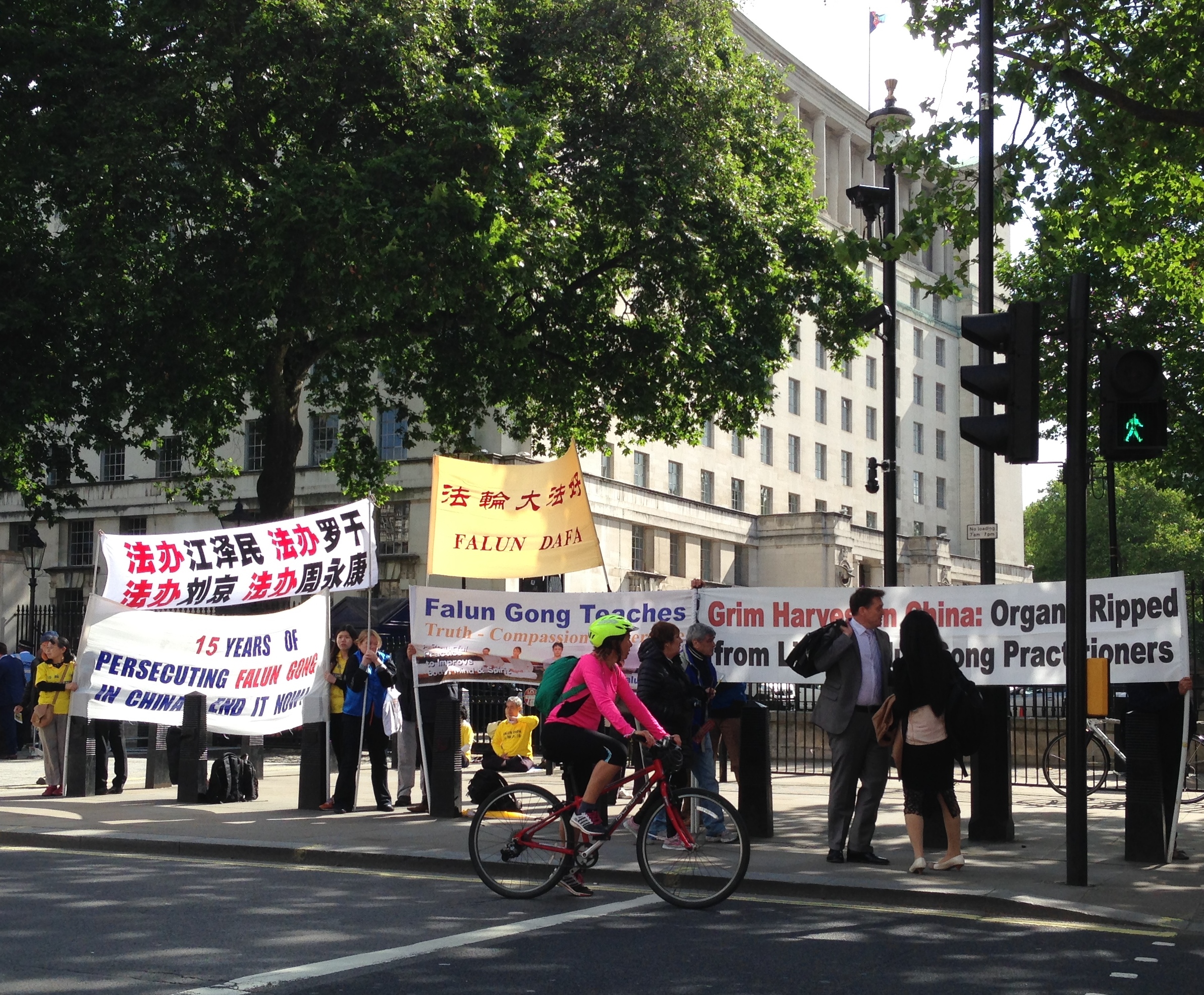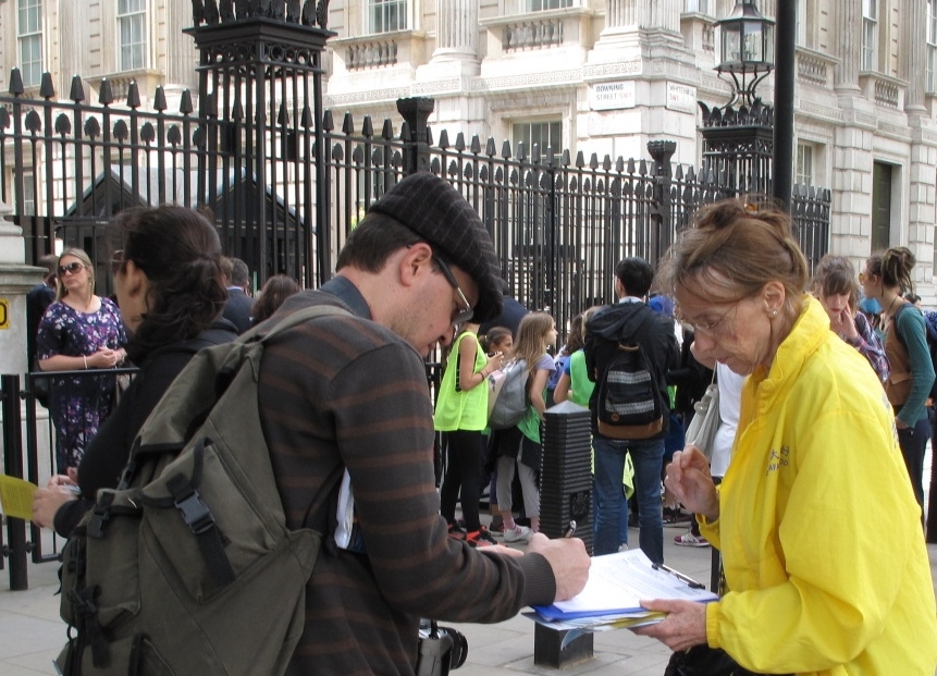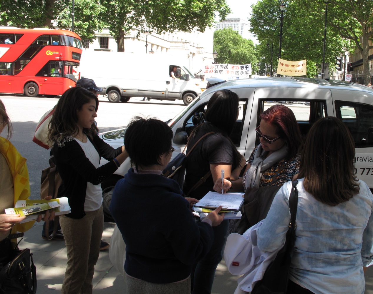 在近十个小时的抗议活动中,有的法轮功学员演示功法,有的发放法轮功真相传单并跟过往人士讲真相。很多在唐宁街大门前驻足观看的人都拿到了传单,他们在阳光下认真阅读。当听到中共的活摘罪恶时,不少人露出不可思议的表情,有的在认真阅读了相关真相资料后立即签名支持“制止强摘法轮功学员器官”。