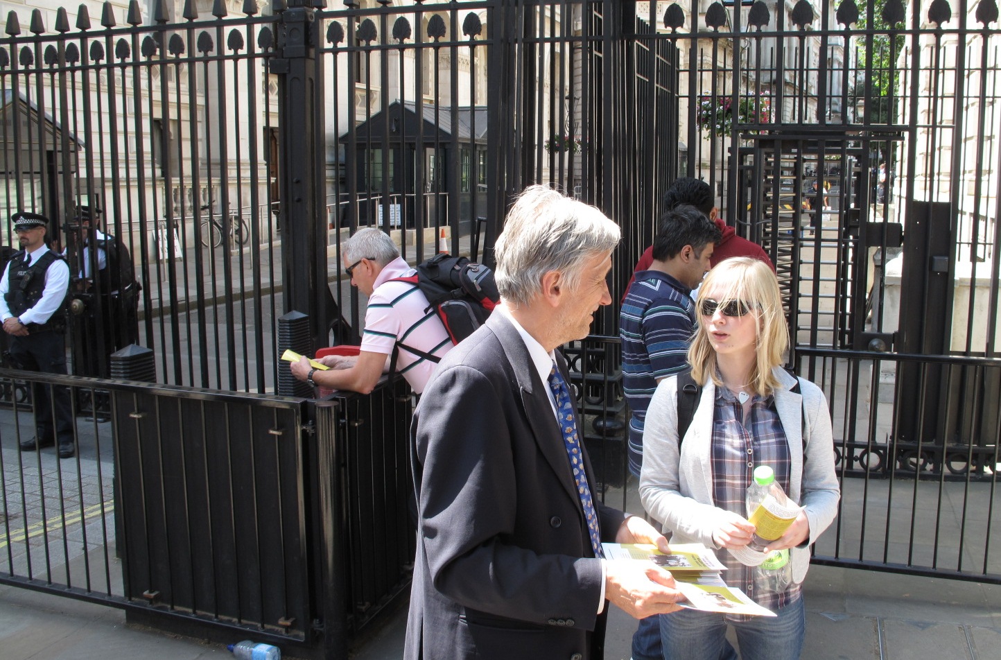![]() 法轮功学员在英国首相府前,跟前来看热闹的人们讲述法轮功的真相。 |