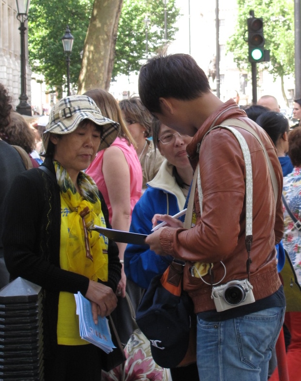 在英国首相卡梅伦与李克强会谈期间,几位西装革履打扮的年轻中国人在首相府大门口来回走动,法轮功学员周女士走上前去和他们攀谈。周女士问他们知不知道法轮功是被冤枉的,几个人有人不吱声、有人想阻止周女士继续往下讲。周女士接着劝告他们一定不要参与迫害,提醒他们现在被抓起来的薄熙来等,都与他们参与迫害法轮功有关。听到这,他们的态度发生变化,开始露出感兴趣的表情,其中一位伸出一只手在周女士的肩头拍了一拍,表示知道了。