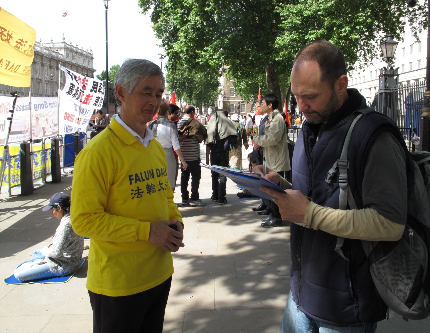 修炼法轮功十三年的豪尔,二零零二年曾经去北京,想去告诉中国人“法轮大法好”,法轮大法弘传世界,结果被中共强行遣返。二零一四年六月十七日这天,豪尔专门从工作单位请假来参加在首相府前的和平抗议, 他说自己和其他法轮功学员一样,就是想借此机会让人知道在中国发生的对法轮功学员的人权侵害。他表示最希望英国政府能公开表态,站起来对中共说“停止迫害法轮功”。