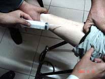 ![]() 酷刑演示:双手背铐锁在刑凳内 |