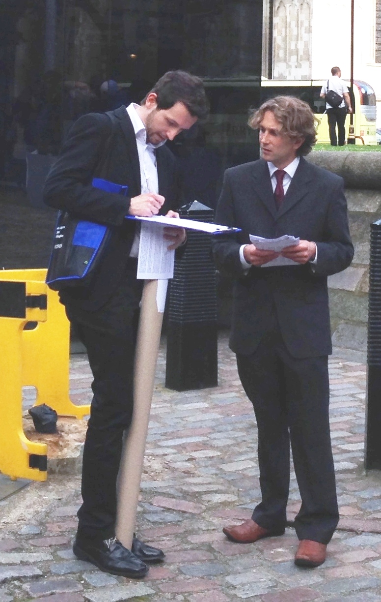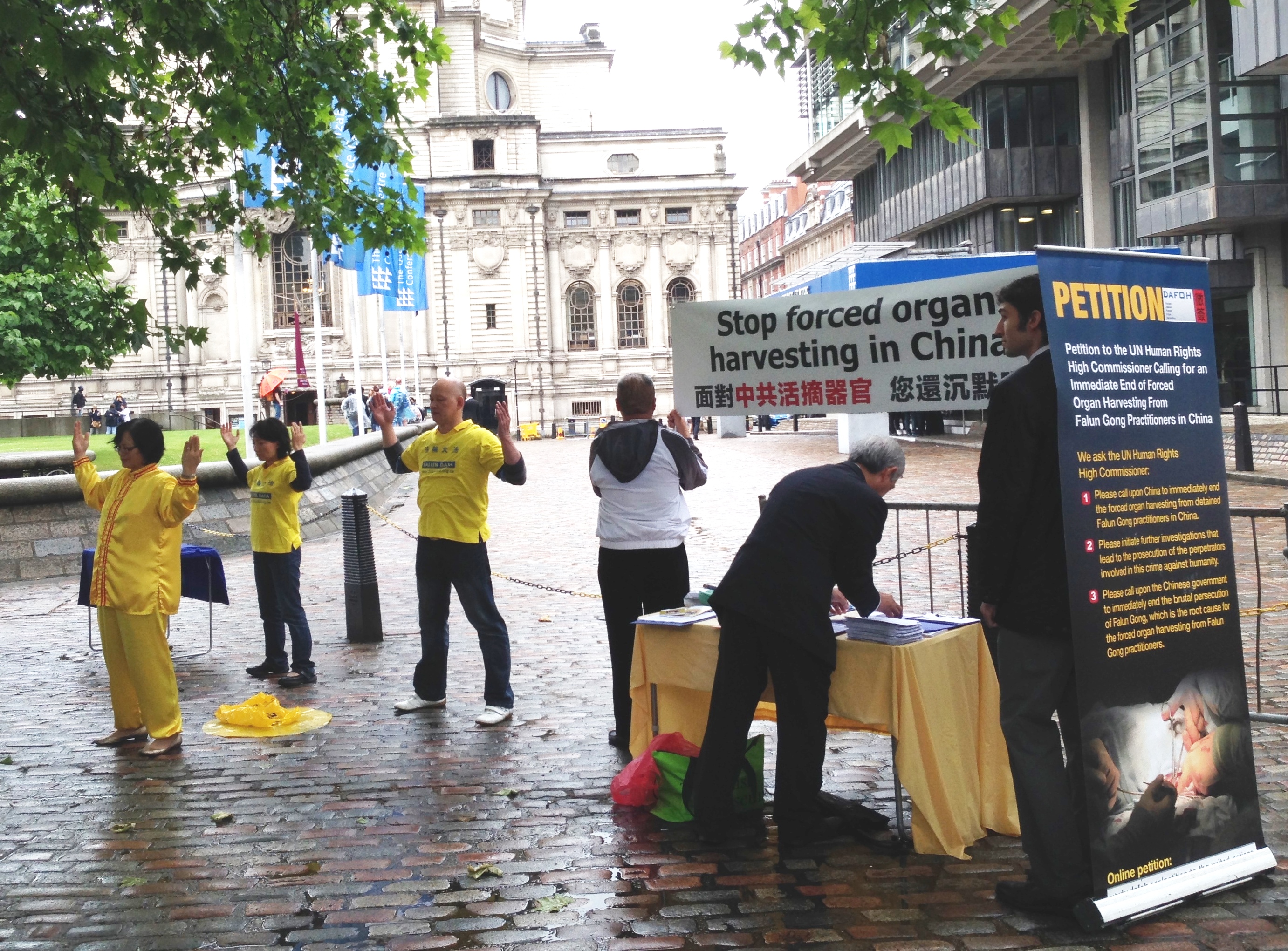 ![]() 图1-2:二零一四年六月七日,法轮功学员在伦敦伊丽莎白二世会议中心外面炼功、讲真相、进行反活摘器官征签 |