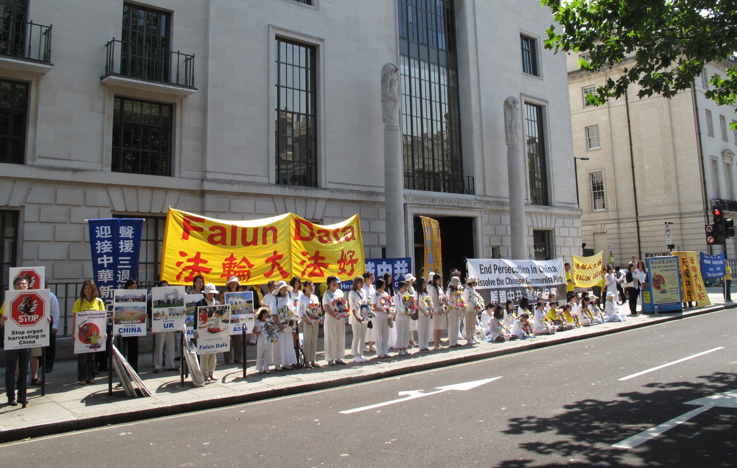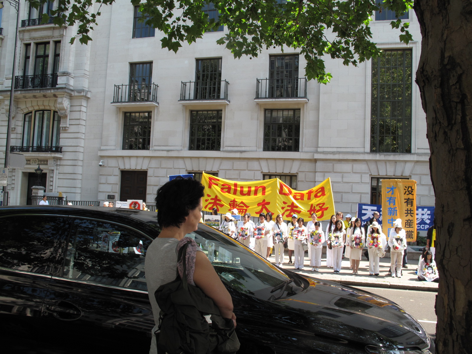 在伦敦中使馆对面举行集会是英国法轮功学员反迫害十五周年活动的开始。上午十一时许,参加活动的法轮功学员汇集在中使馆对面,几十位女学员身着白衣、手捧被中共迫害致死的大陆同修遗像;学员们打出“法轮大法好”、“请帮助停止中共活摘法轮功学员器官”、“解体中共 制止迫害” 和“天灭中共 天佑中华”等横幅。英国法轮大法学会代表和两位曾在中国大陆遭受中共严重迫害的法轮功学员先后发言。
