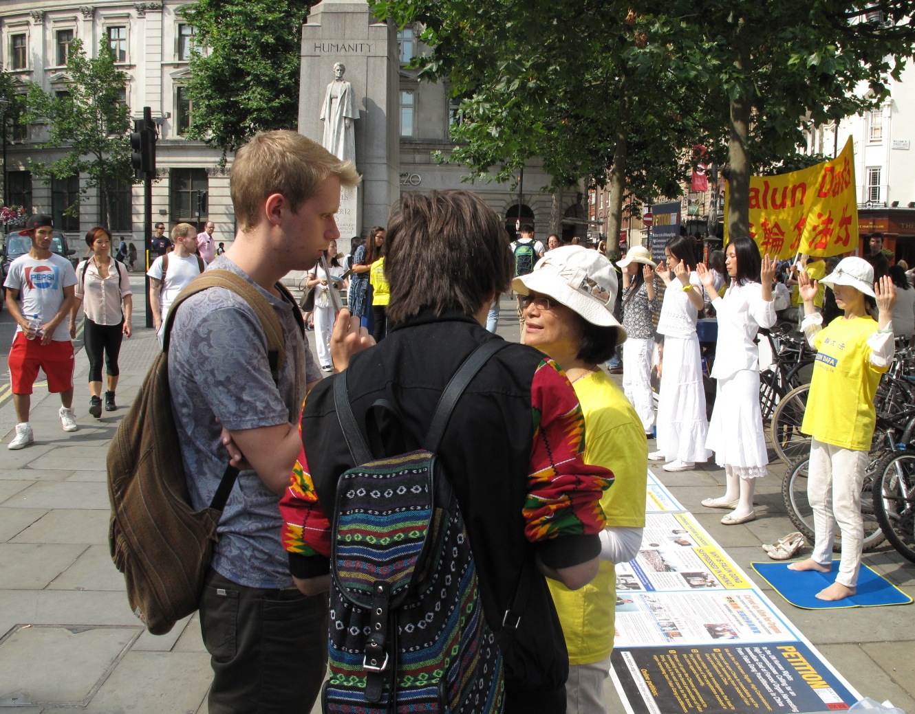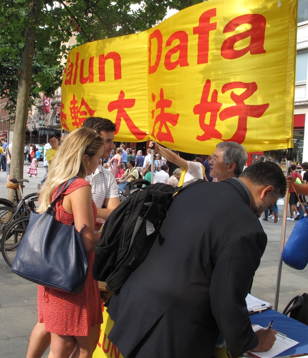 圣马丁广场是法轮功学员长期坚持周末弘法讲真相的地方,也是七月十二日这天英国法轮功学员游行的终点。一些刚刚完成游行的学员立即加入圣马丁广场的集体炼功和讲真相活动。新增的横幅、集体炼功场面,吸引更多路人关注。人们震惊于中共邪党在中国对法轮功的残酷迫害,特别是活摘法轮功学员器官的反人类罪行,他们踊跃地在要求制止活摘罪行的征签表上签名。