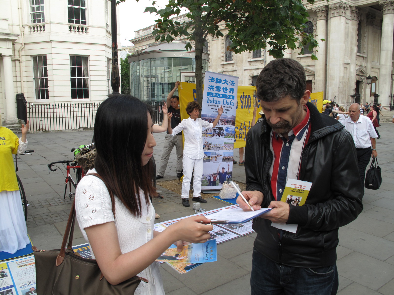 ![]() 伦敦人安东尼主动要在征签表上签名,称活摘法轮功学员器官是“野蛮的,深深伤害人类尊严的,必须制止”。 |