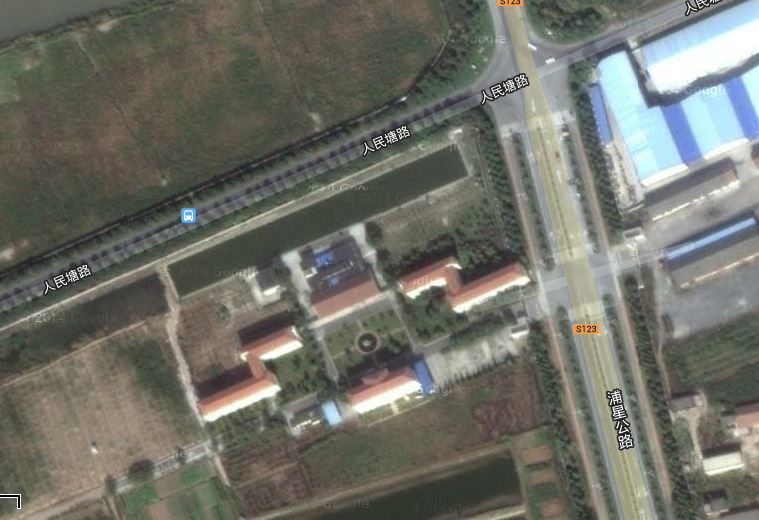 浦星公路9900号对外挂牌“七五一基地”,位于浦星公路和人民塘路交汇处的西南角。洗脑班在其院内的二号楼,从照片上可以看到大门内右侧就是二号楼,也就是卫星地图中最右面靠马路的那一幢。院墙北面人民塘路上的公交站牌是奉卫线--五七一站(奉城-金山卫)、海湾1线和海湾3线--人民塘路浦星公路站,那条路上行人车辆比较热闹。