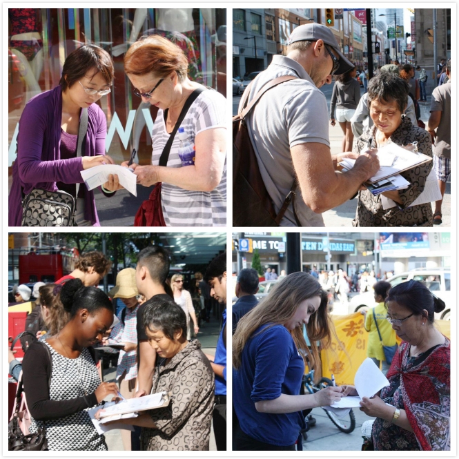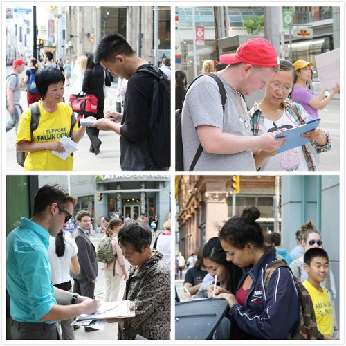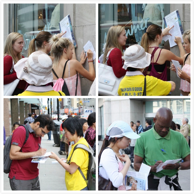 从七月十四日到十七日,多伦多的法轮功学员在市中心最繁华的几个十字街头举办真相展、征签、和制止活摘明信片征签活动;在市中心,在人流最旺的十个地铁站口向民众面对面讲真相;随后还将于周末举行大型的集会、烛光悼念活动。