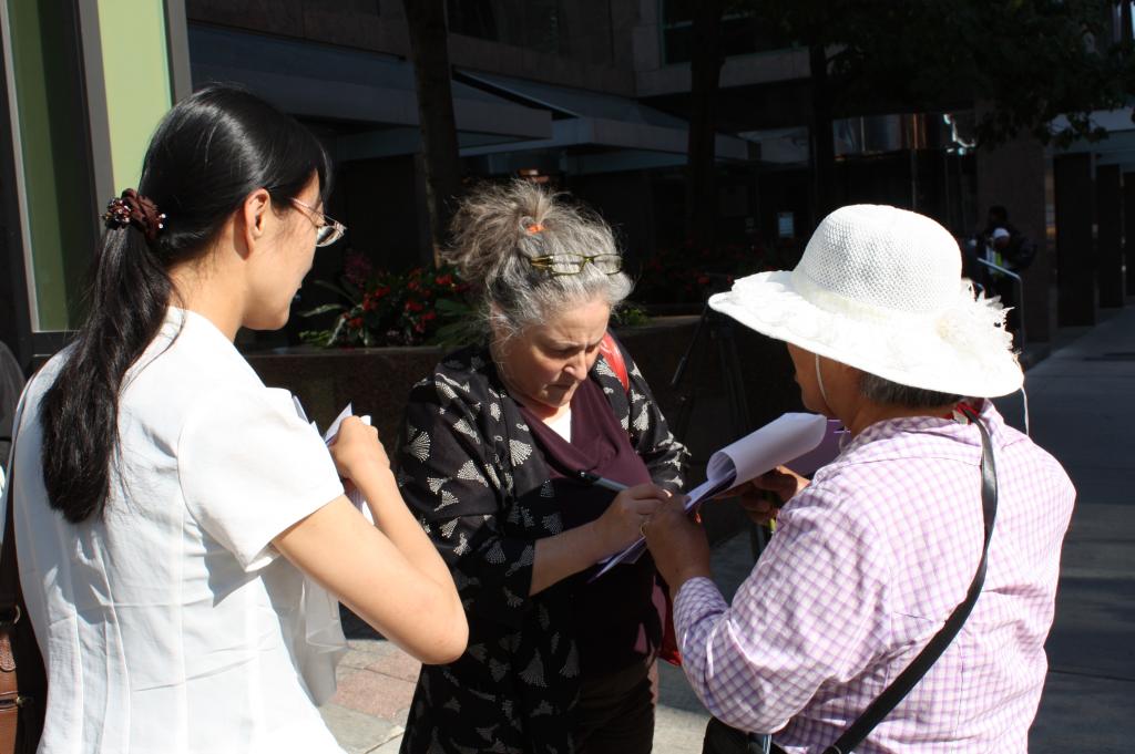 ![]() 图10:多伦多市民法庭翻译Georgie在路口Yonge/Queen遇见了这次的活动,签名表述支持反迫害。 |