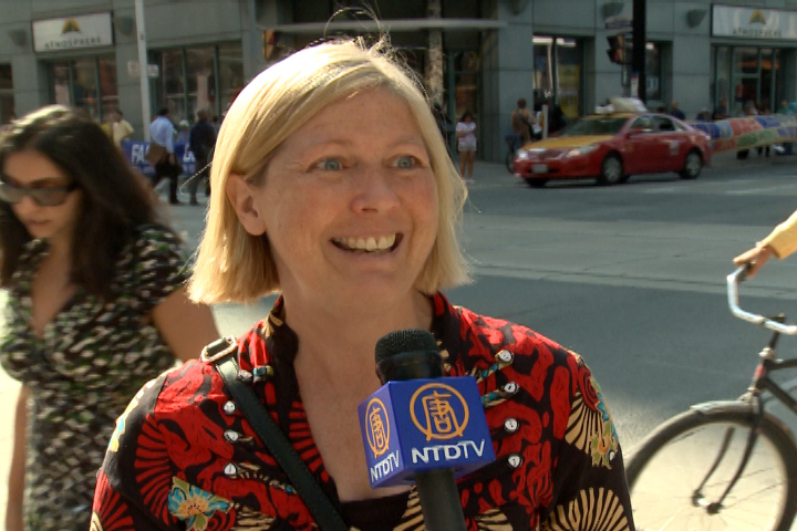 多伦多市民法庭翻译Georgie在路口Yonge/Queen遇见了这次的活动,她在征签表上签完名后说:“我很欣慰看到他们(法轮功学员)在这里和平的抗议,让人们在这里了解到他们是谁,他们在这里干什么。让所有的人知道真相很重要。”