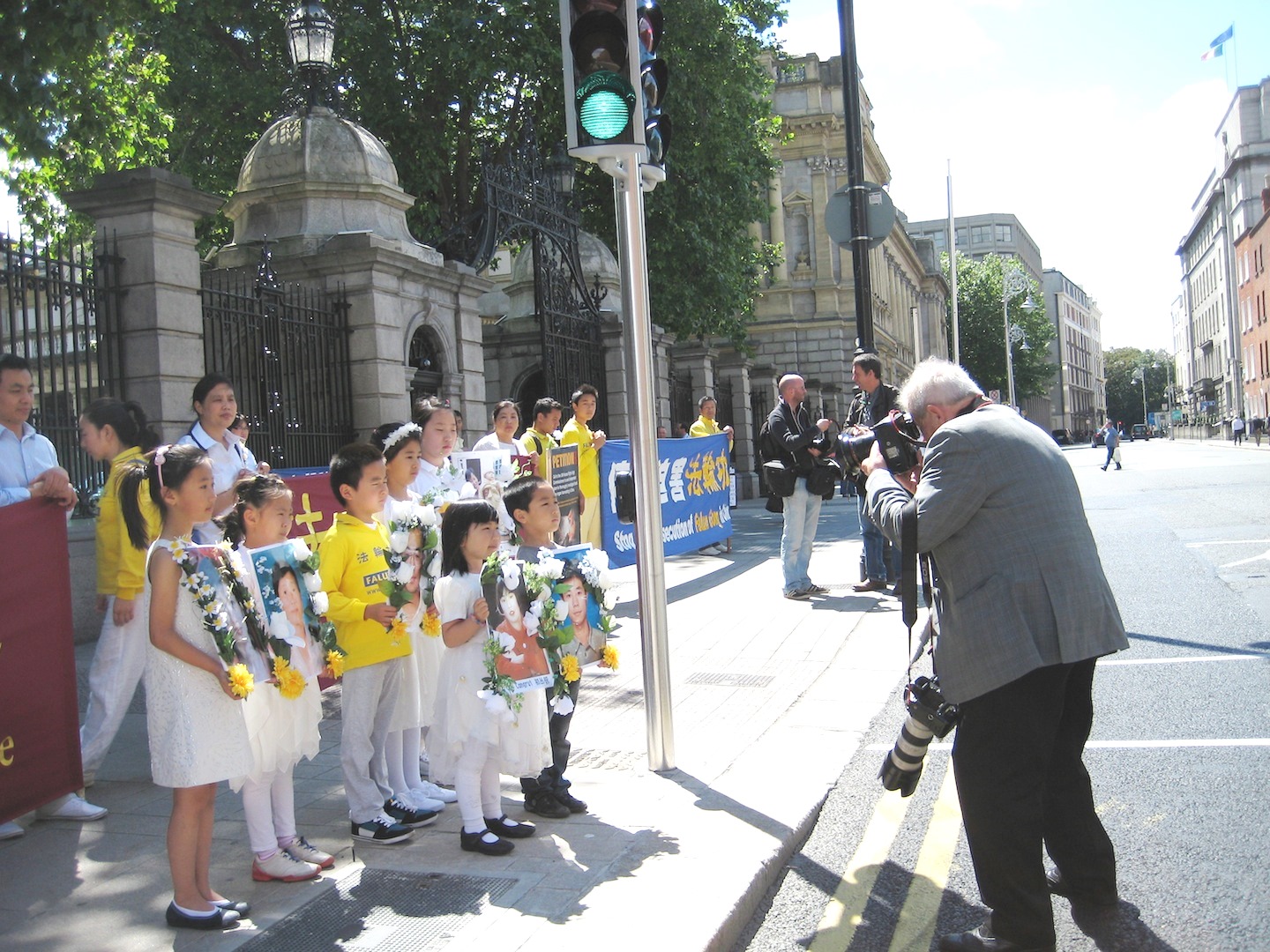 图1:爱尔兰法轮功学员的游行队伍在爱尔兰议会大楼门前暂留,爱尔兰主流媒体报纸的摄影记者给游行队伍拍照。