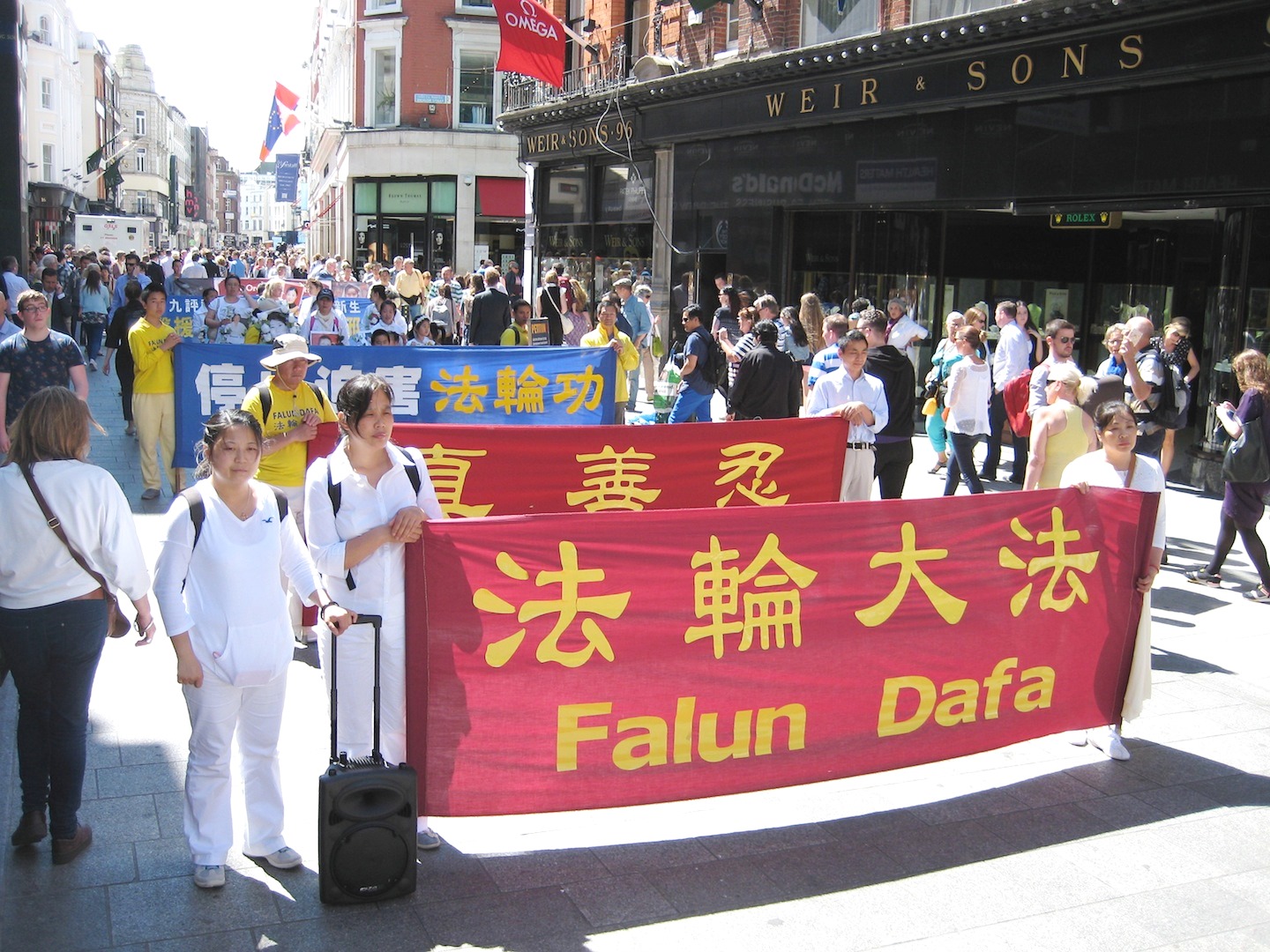 图2:法轮功学员的游行队伍穿过都柏林市中心最繁华的步行街格拉夫顿大街(Grafton Street)