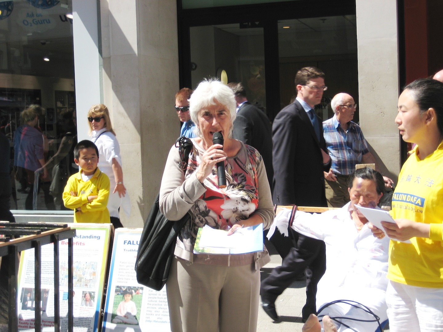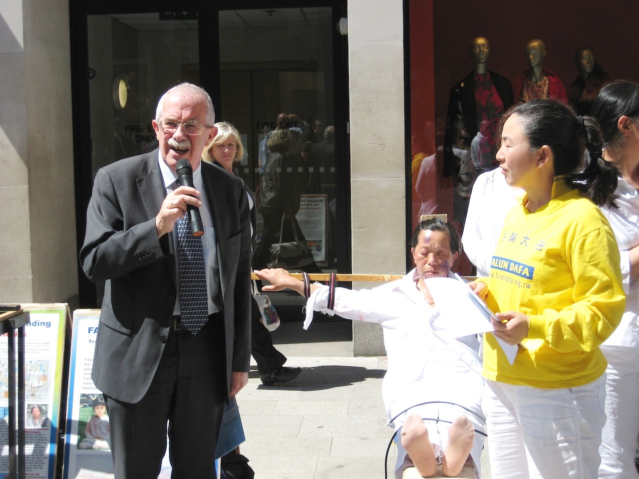 游行队伍最后在都柏林最繁华的步行街——格拉夫顿大街(Grafton Street)举行集会,一边是法轮功学员祥和地演示五套功法;另一边是法轮功学员在烈日下模拟中共酷刑,这鲜明的对比使行人们感到震惊。七月是爱尔兰的旅游旺季,格拉夫顿大街上簇集着来自世界各地的游客。很多人停下脚步聆听法轮功学员的发言,索取真相小册子,并在呼吁停止迫害的签名表上留下他们的支持。