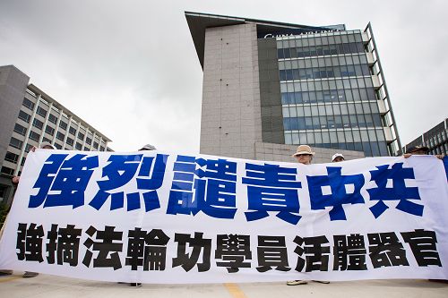 ![]() 图4、5、6:中共国台办主任张志军二十六日在新北市五股区与新北市长朱立伦会面,法轮功学员高举“强烈谴责中共强摘法轮功学员器官”横幅。 |