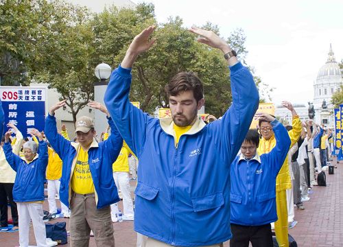 ![]() 图1:法轮功学员在旧金山联合国广场集体炼功 |