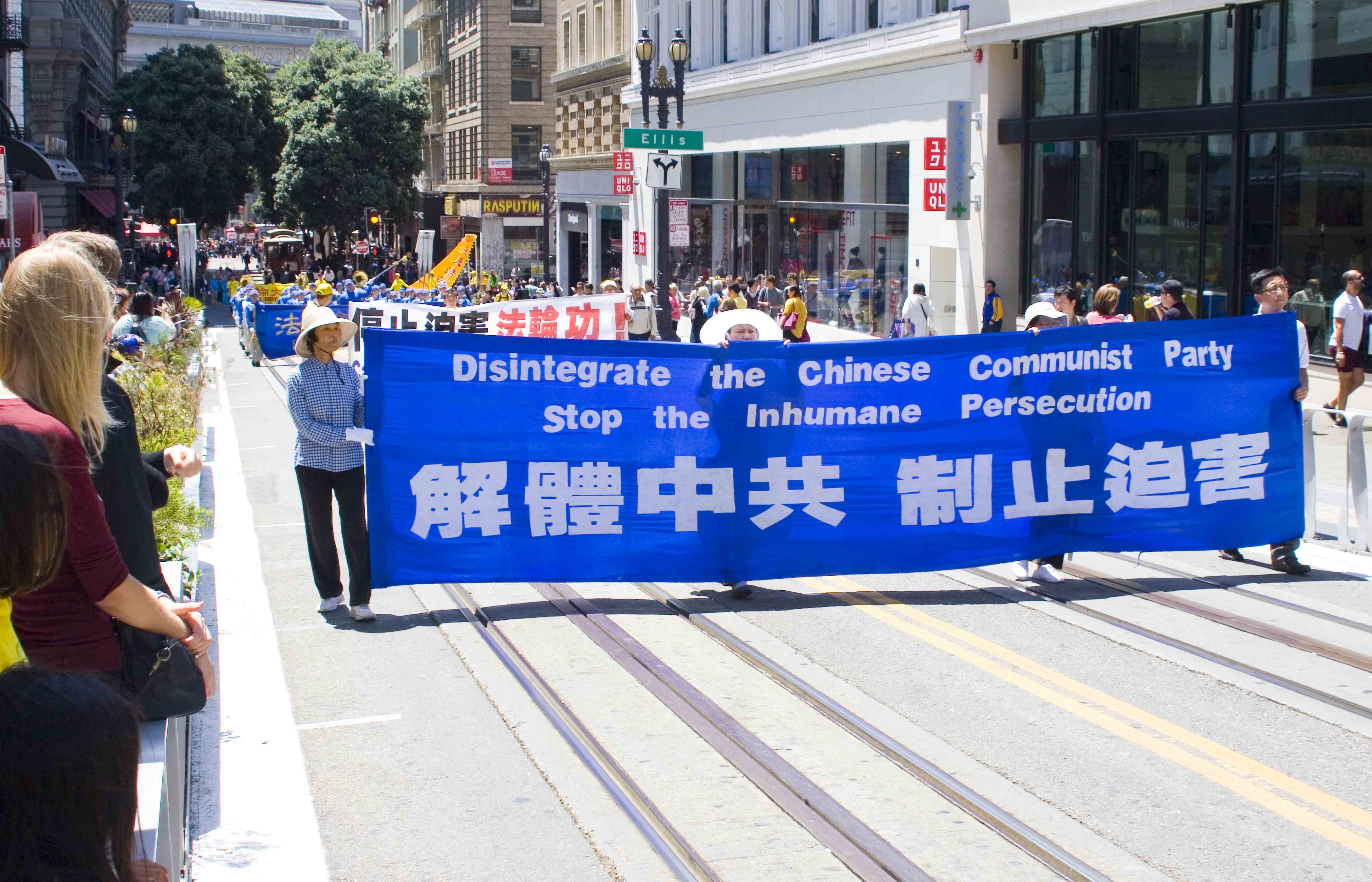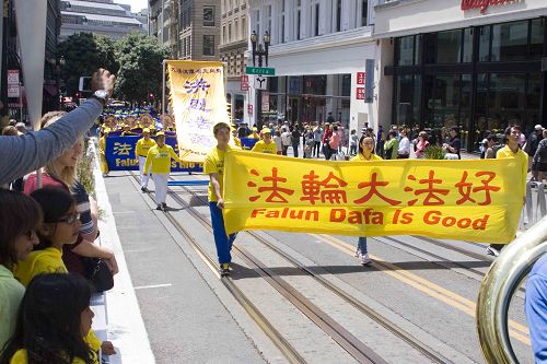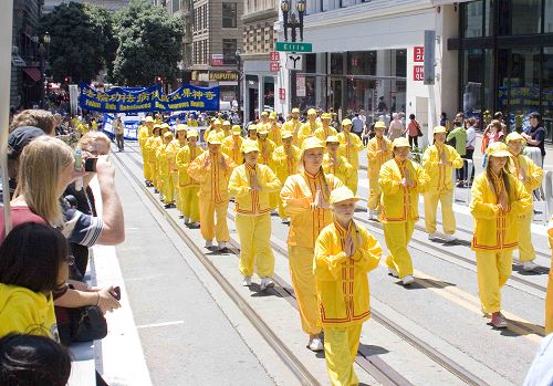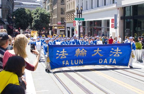 七月十九日,旧金山法轮功学员的游行队伍于中午十二点开始从位于市政厅附近的联合国广场出发,在声势浩大的美西天国乐团的引领下沿着市场街经过主要市区,再环绕中国城,最后抵达中国城花园角广场举行集会。