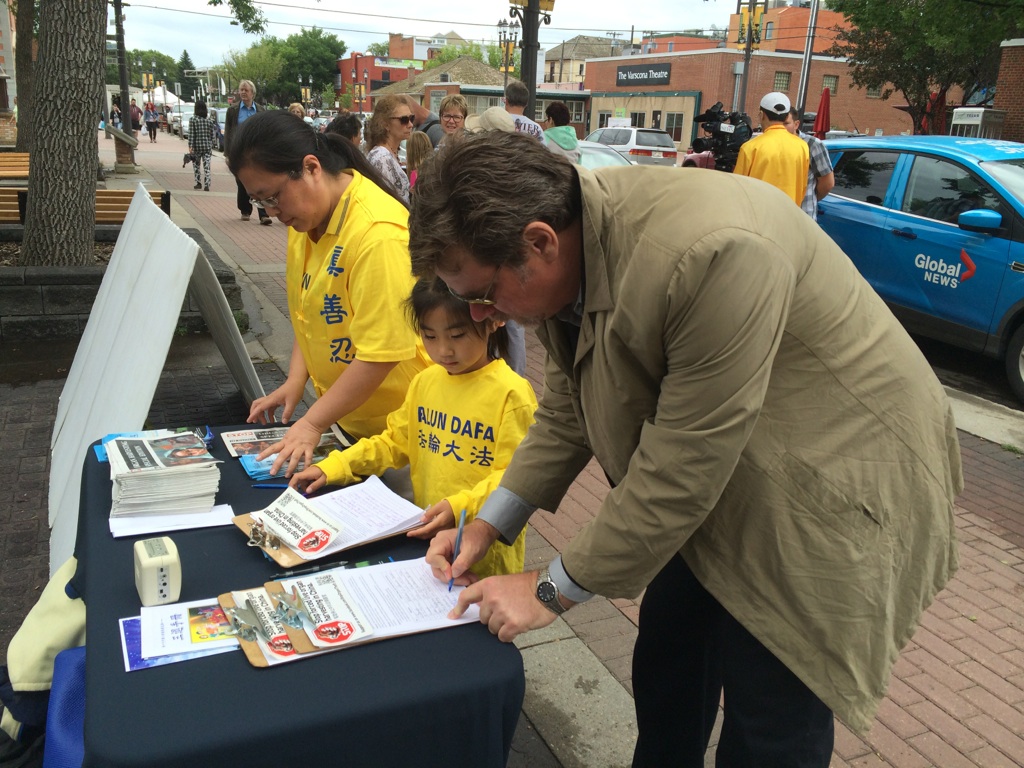 国会法轮功之友主席、独立国会议员布伦特•拉特戈贝尔(Brent Rathgeber)到集会现场支持。他表示加拿大政府了解法轮功学员被迫害的情况,也了解包括罗宾•李的姐姐在内的被中共关押的加拿大公民的亲人的情况,加拿大政府将一如既往地帮助制止对法轮功的迫害。