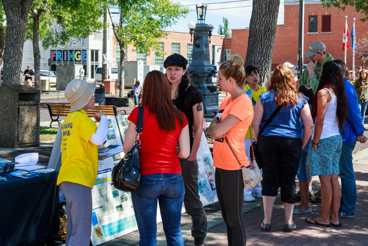二零一四年七月十九日,加拿大埃德蒙顿法轮功学员在熙熙攘攘的农贸市场旁的公园举行集会,向社会各界揭露中共对法轮功群体的迫害,同时展示法轮功的美好。