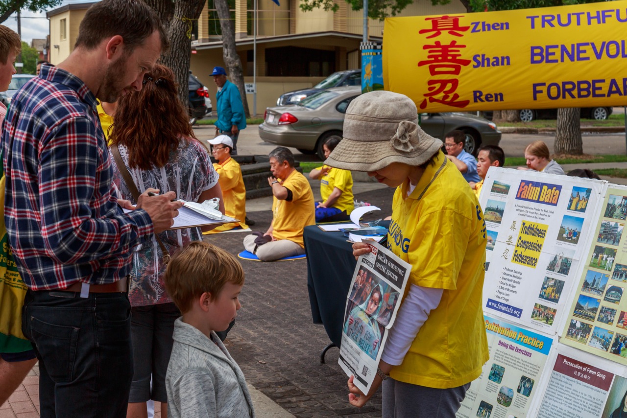 集会结束后,法轮功学员向民众展示功法。祥和宁静的场面和巨大的能量吸引很多过往行人。民众纷纷驻足观看,了解真相,并在征集表上签名。