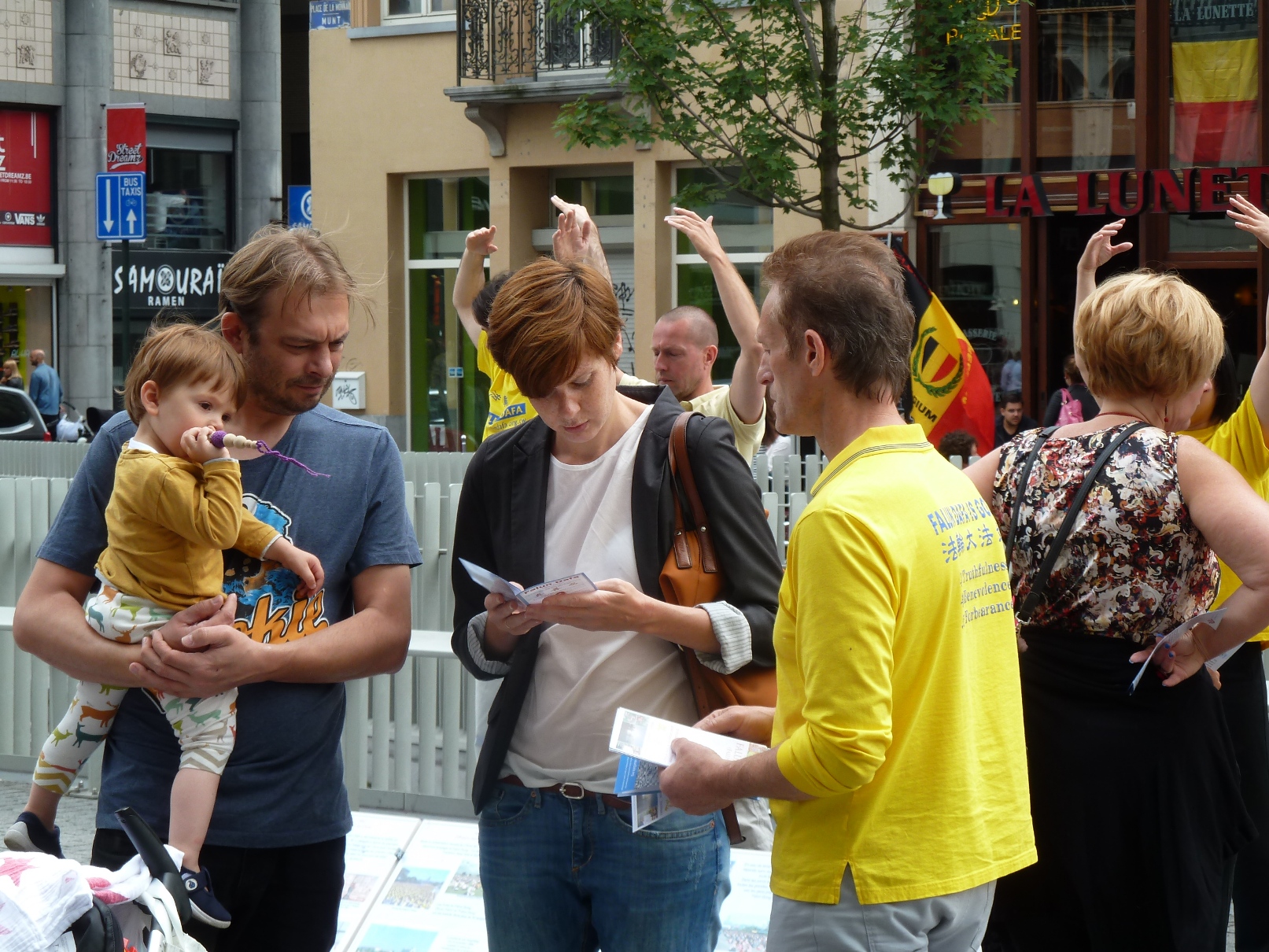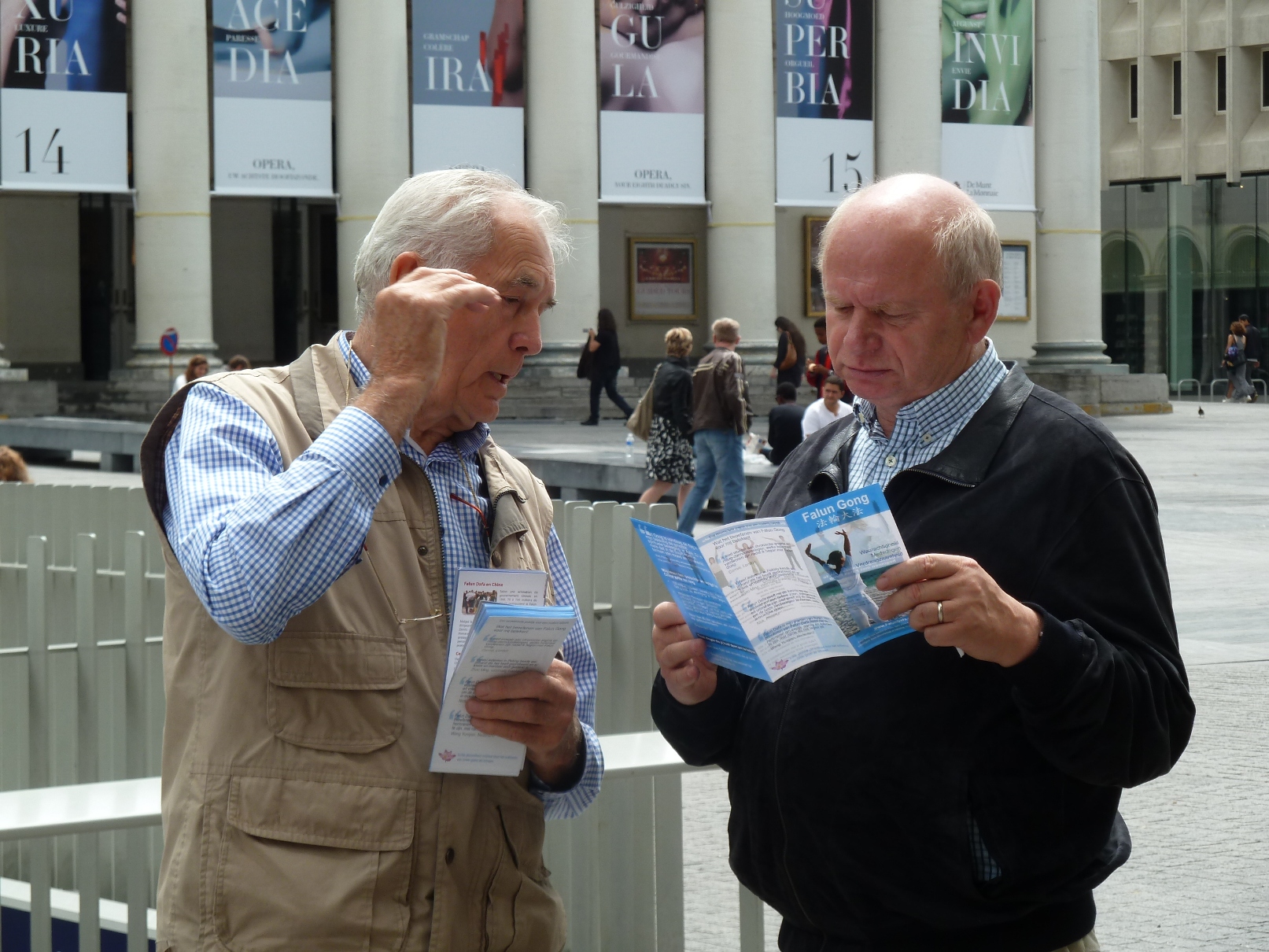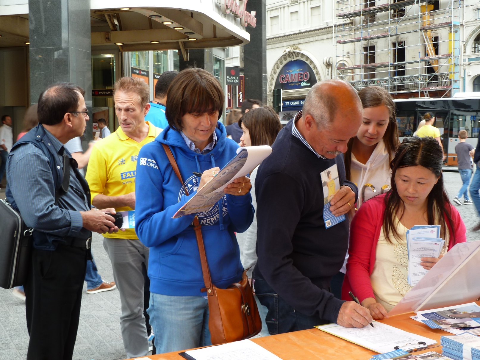 “这是真的吗?太令人吃惊了!”一面看着祥和打坐的法轮功学员,一面听闻这样美好的功法在中国遭受如此残酷的迫害,许多比利时人发出惊叹。许多过路民众在和法轮功学员交谈中了解到活摘器官的罪行之后,郑重签下自己的名字。来自英国的教师Joseph Mctaggart就是其中一位。他说:“法轮功是那么平和。我非常难过看到这些迫害的事情,特别是签名簿上说的那些(活摘器官的罪行)。这种对人性的迫害,真令人伤心。我很在意生活在地球另一端的兄弟姐妹,我想为他们做点什么。”