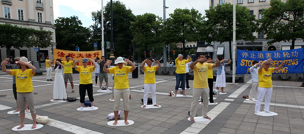 北城广场(Normalmstorget)位于斯德哥尔摩品牌街附近,来来往往的车辆川流不息。七月十九日上午,法轮功学员在这里集会,纪念法轮功反迫害十五周年。集会现场打出“停止迫害法轮功”、“解体中共”、“法轮大法好”等横幅。他们通过祥和的功法展示、真相横幅、展板、征签等方式呼吁制止迫害。
