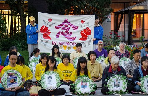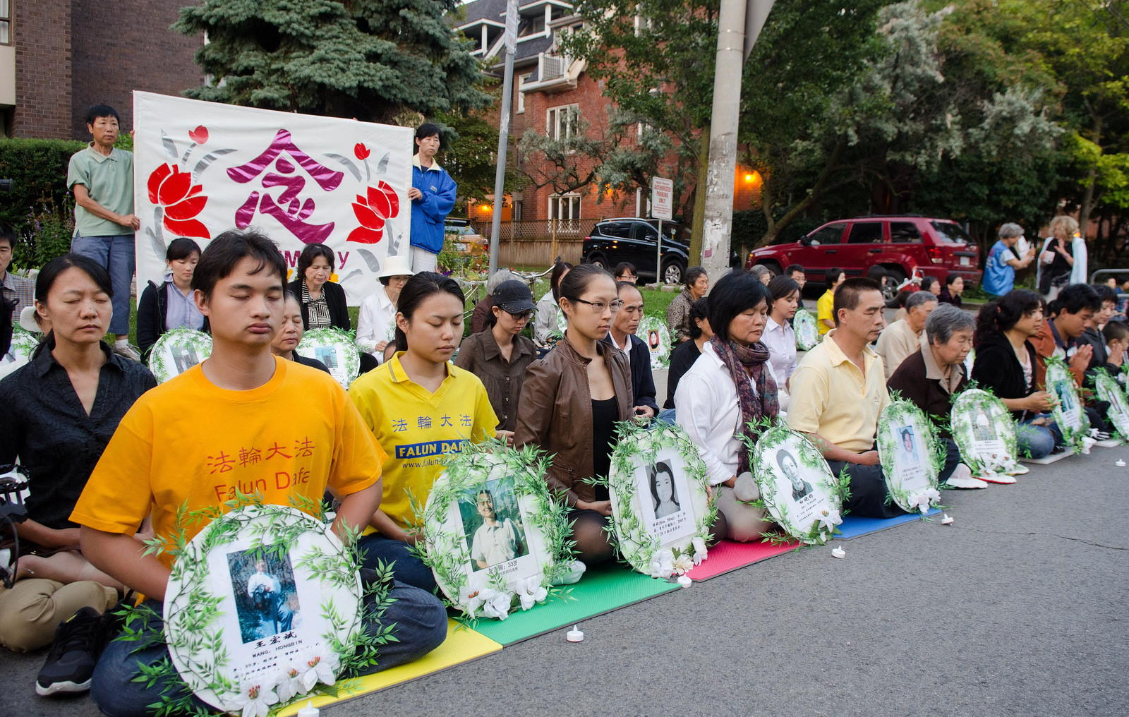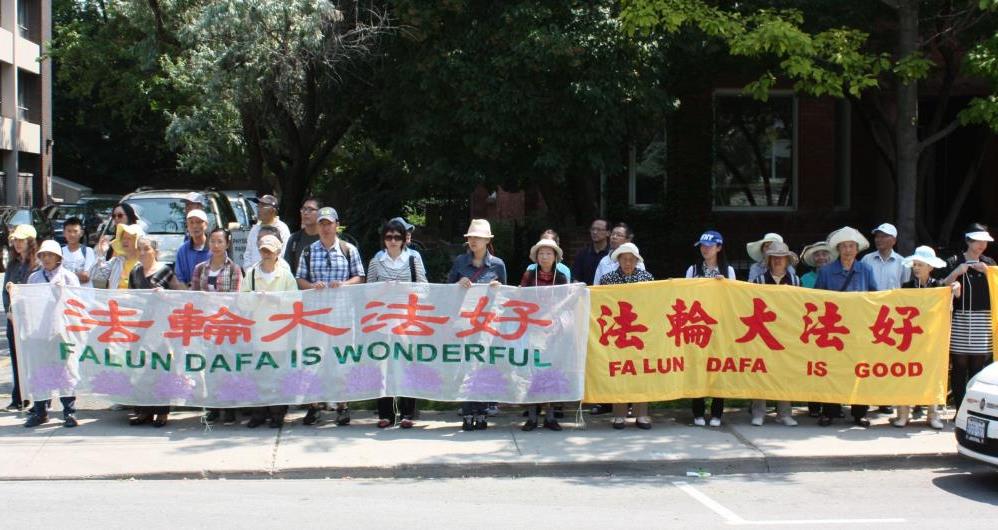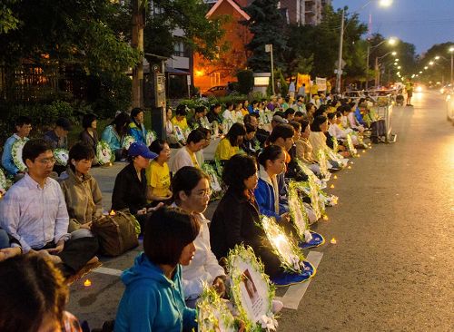继七月十四日到十七日(星期一至四)在各繁华路口给上班族的民众面对面讲真相后,十八日星期五上午,法轮功学员在St.Gorge街的中领馆门前举行集会,纪念反迫害十五周年;二十日的晚上八点至十点,法轮功学员在中领馆前举行了烛光悼念活动,谴责中共暴行,呼唤正义良知,结束迫害。
