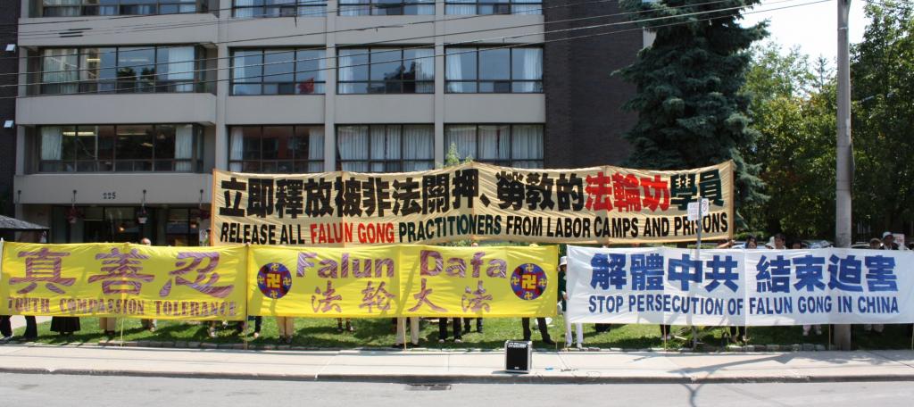 ![]() 图1-5:十八日星期五上午,多伦多法轮功学员在St,Gorge 街的中领馆门前举行集会,纪念反迫害十五周年。 |