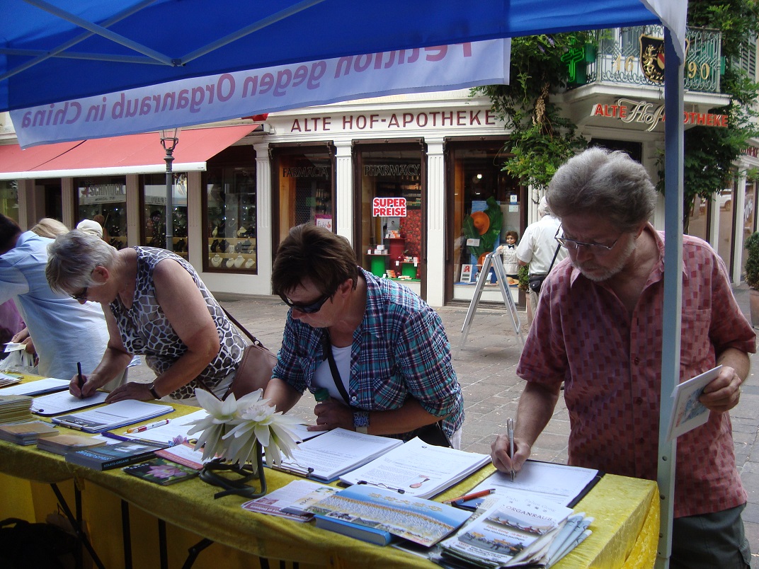 一位德国老太太从精品店出来,接了学员一张传单,说没戴眼镜得回家去看了。她问传单上面说的什么事?学员告诉她是中共活摘器官。老太太怕听错了,追问了二遍听明白了后嚷道:“什么?!我都没听说过!”学员说:没错,您肯定没听说过。老太太说:我儿子在中国武汉学过中医,回德国开了诊所。我得把这张传单带给他,他和他的同事都应该来这签名。