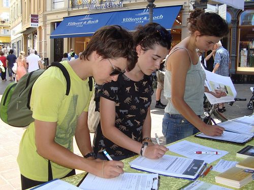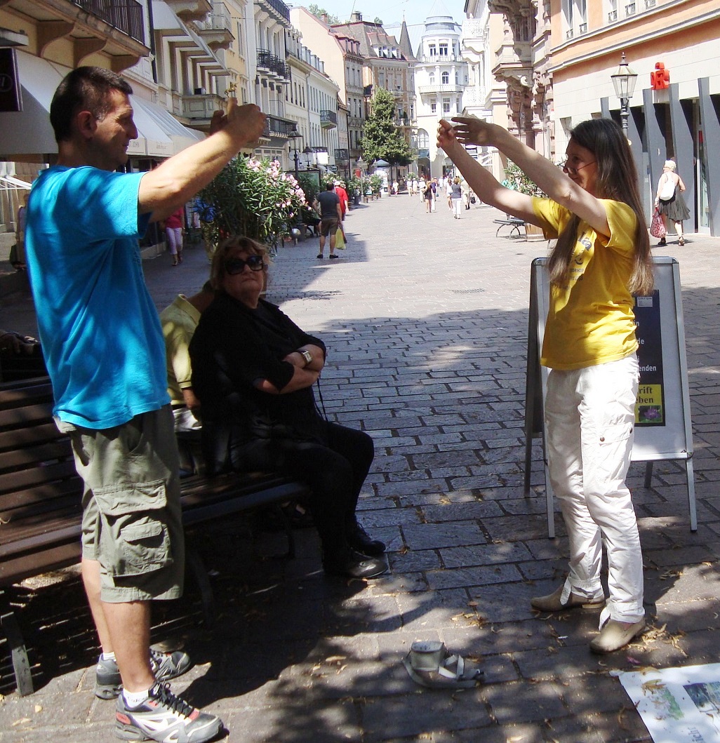 巴登巴登市的法轮功信息日活动中,民众签名谴责中共暴行