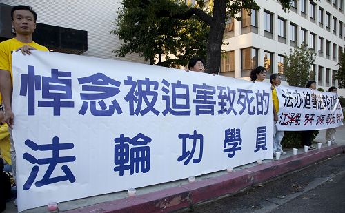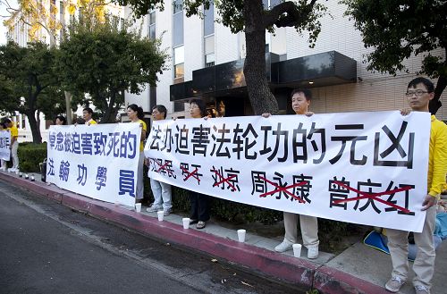 洛杉矶法轮功团体发言人、加州大学洛杉矶分校(UCLA)教授吴英年表示:“今天我们来到这里是谴责血腥罪行,责令中共邪党立即停止对法轮功的血腥迫害,法办江泽民、罗干、刘京、周永康、曾庆红等元凶,严惩各级不法官员、打手、喉舌。”