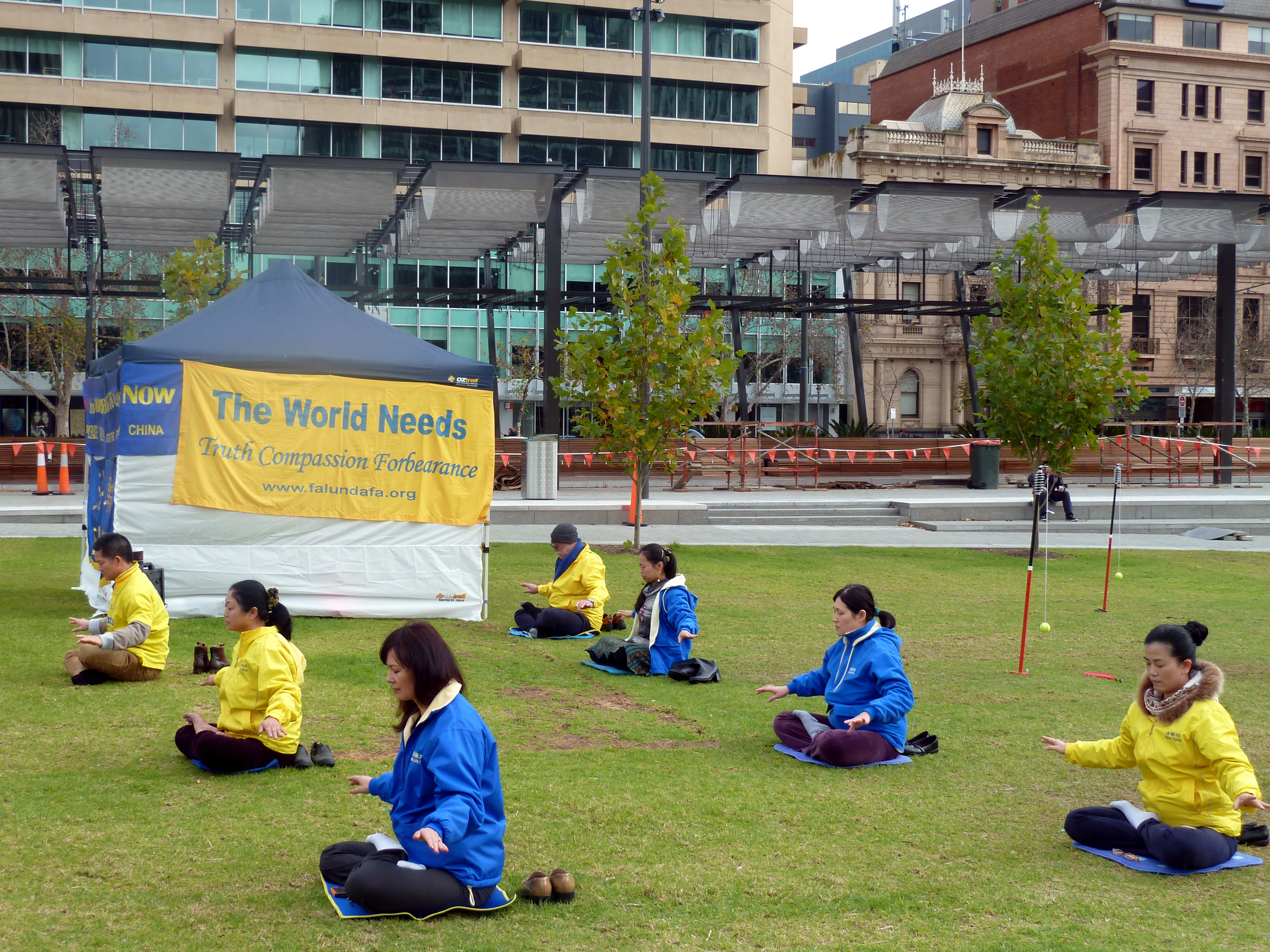 法轮功学员在展示法轮功五套功法时,悠扬舒缓的炼功音乐和以“缓、慢、圆”为特点的功法动作也吸引了众多过往的行人。南澳民众克里斯•穆弗德(Chris Mufford)女士特意前来对法轮功学员讲述了遇到法轮功后的神奇经历。
