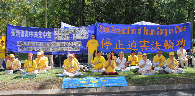 西班牙诉江案律师卡洛斯先生也前来参加集会活动,他通过高音喇叭发表演讲。他告诫那些仍在迫害法轮功学员的中共官员立即停止作恶,他指出,人间的法律不会放过那些犯下酷刑罪、群体灭绝罪等反人类罪行的罪犯。