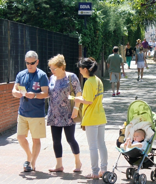 一对西班牙夫妇开车经过,看到法轮功学员和平抗议的场面后,特意将车停下来了解真相,当听说中共活摘法轮功学员器官时非常震惊和愤怒,他说:“这样的恶行简直比纳粹还要凶残!”他们在征签表上郑重签上自己的姓名,并表示要告诉所有他认识的亲朋好友都来声援法轮功。