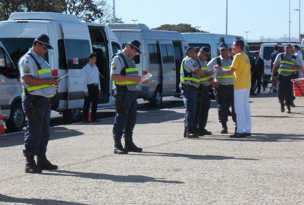 法轮功学员们在广场上坚守了两整天,这期间中共驻当地使馆的官员极度紧张,他们在学员拉横幅的路边停了一排中型面包车挡住法轮功学员(最少时四辆,最多时七辆),还不时停下双层大巴车,派遣官员来频繁挑衅辱骂法轮功学员。此外,他们还多次打电话招来各种类型的警车和警察,企图对学员进行骚扰,而法轮功学员们始终和平、理性地讲真相。一批批警察明白真相后撤走了,一车车随习近平来巴西的中国人也见证了法轮功学员们的坚定意志,其中有几个中共保安在学员讲真相劝说下退出了中共邪党。