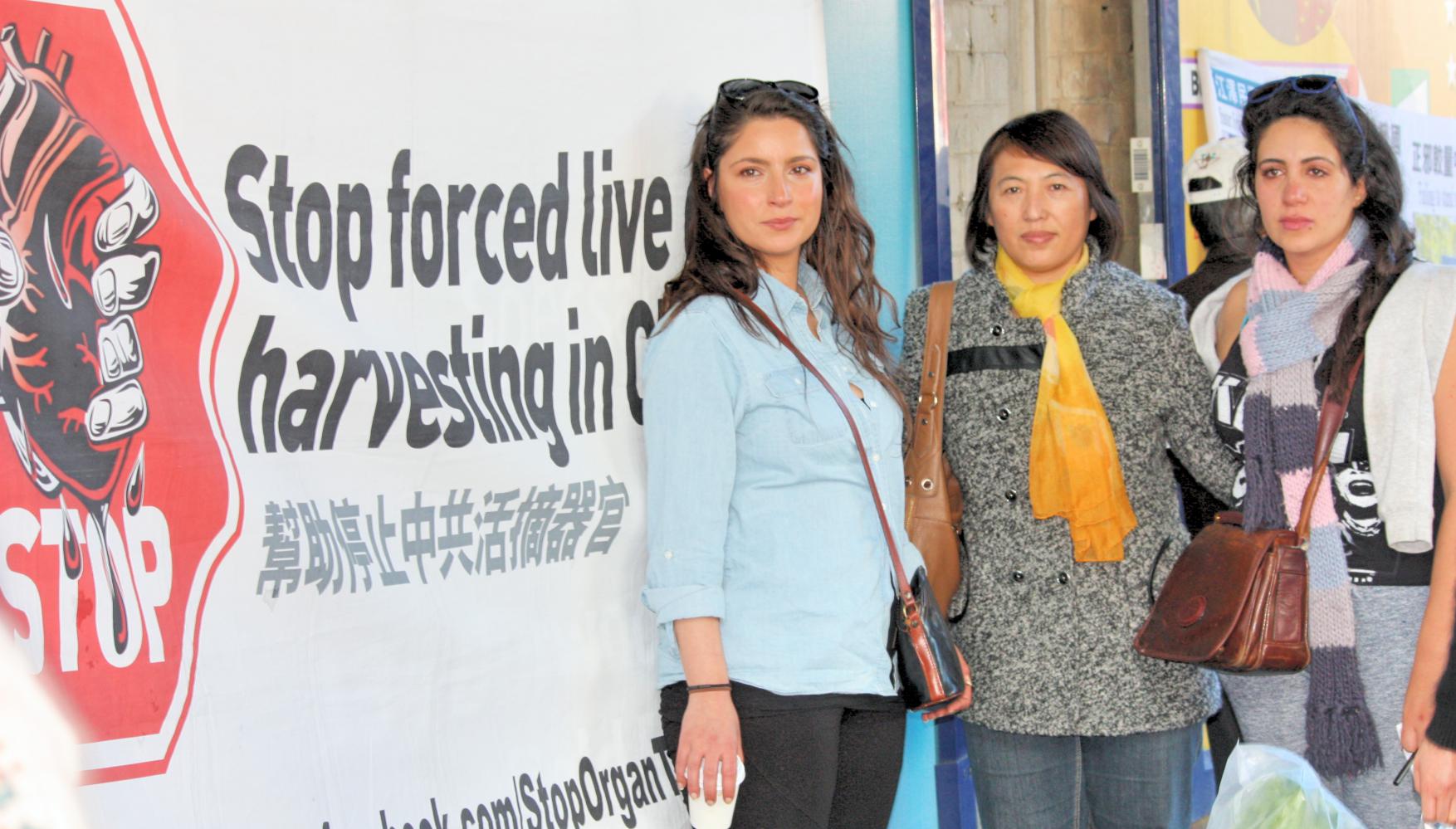 七十岁的王校芳曾被非法关押在新疆乌拉泊女子劳教所一年,她通过翻译告诉Daniella:“我在劳教所时,他们用针扎我,不让我睡觉,还要求这么坐着(她做半蹲姿势给大家看),如我动一动他们就甩我耳光。我们吃的是长了这么长的芽和变绿色的土豆,或吃那种已经糊了一大半的饼,那时我已经五十多岁、快六十岁的人了,他们还给我验血三次(为活摘器官)。”Daniella听完王女士的故事非常感动,含着眼泪拥抱和轻吻王女士,又和一旁站着拿着真相横幅的王女士的先生握手致意才依依不舍地离开。