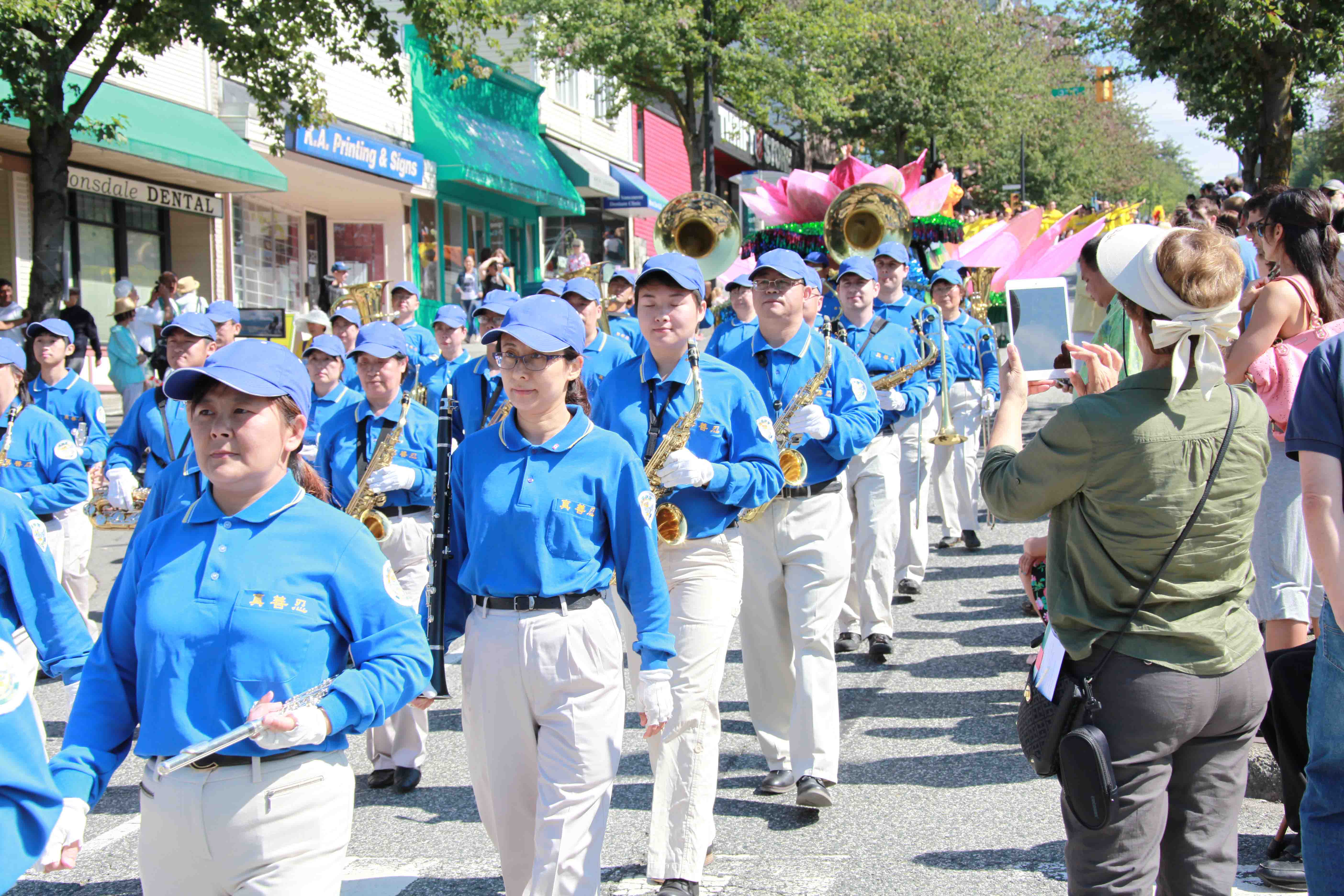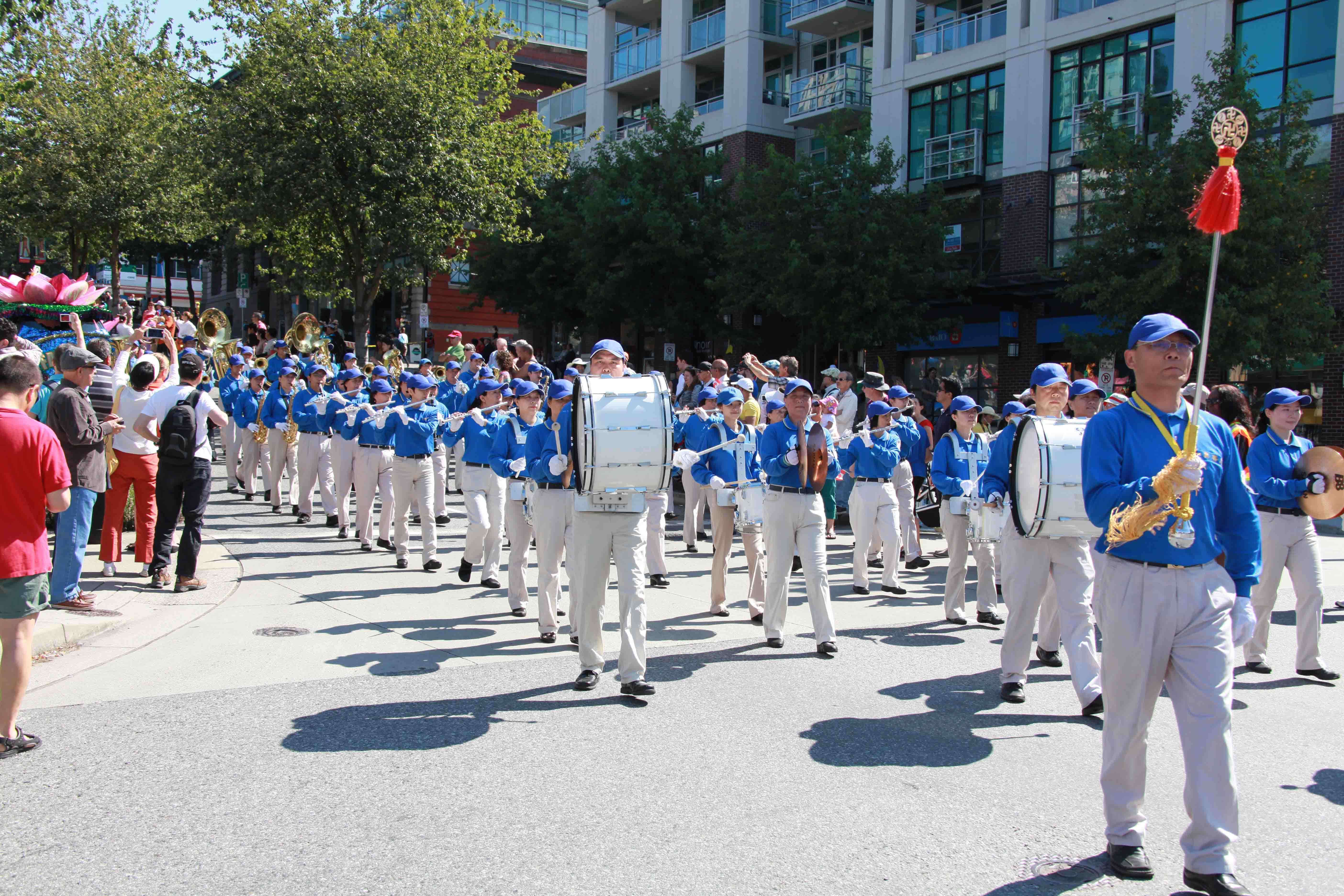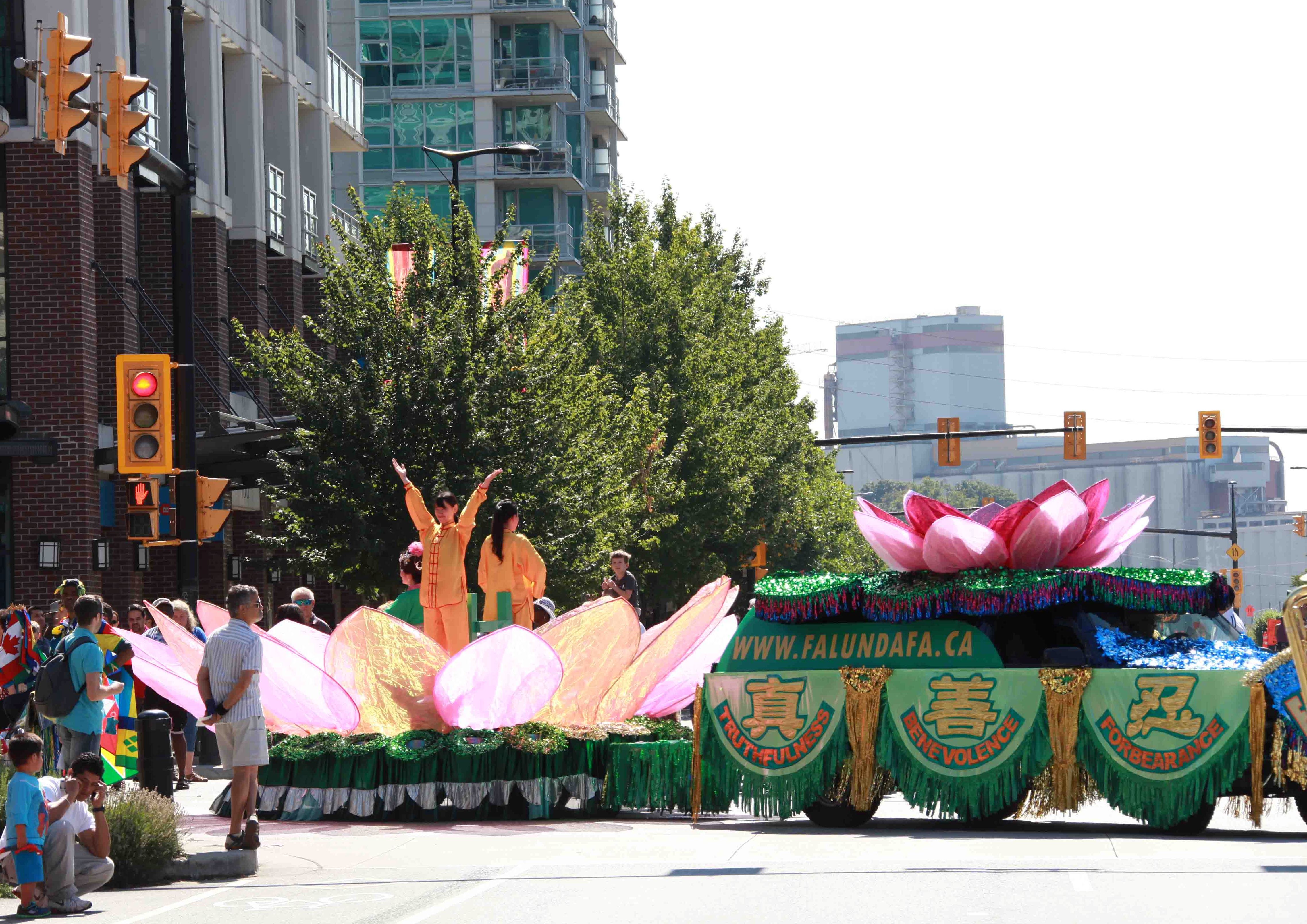 法轮功的游行队伍包括天国乐团、“真善忍”花车和法轮功功法演示队。天国乐团演奏了《永远的枫叶》、《法轮大法好》、《送宝》等乐曲,法轮功的游行队伍所过之处,受到观看游行的市民们的热烈欢迎。很多人随天国乐团的音乐起舞应和,有的市民跟随法轮功功法演示队学炼法轮功动作,有的市民兴奋地与游行队伍前排打横幅的学员击掌表示感谢和鼓励,更多的市民纷纷鼓掌和拍摄法轮大法的游行队伍。当法轮功的游行队伍走过主席台时,主持人在介绍了法轮大法后说,他们如此出色,让我们一起为法轮功热烈鼓掌。